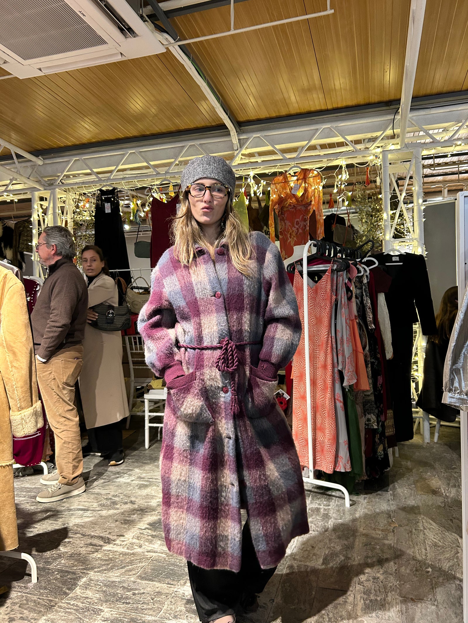 Abrigo large de cuadros en tonos morados, blancos y grises, con cinturón cuerda y cuello ancho. Botonadura frontale.