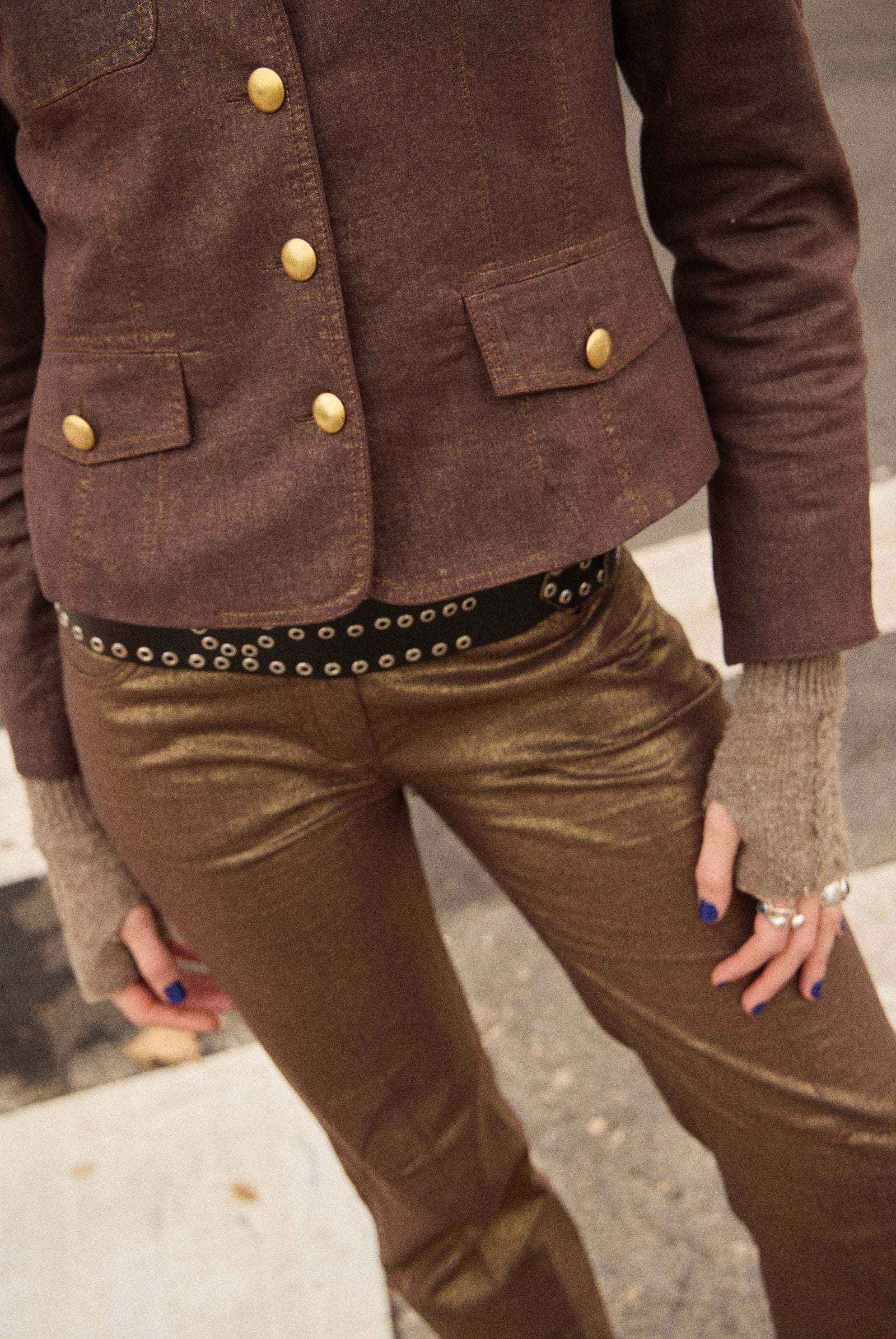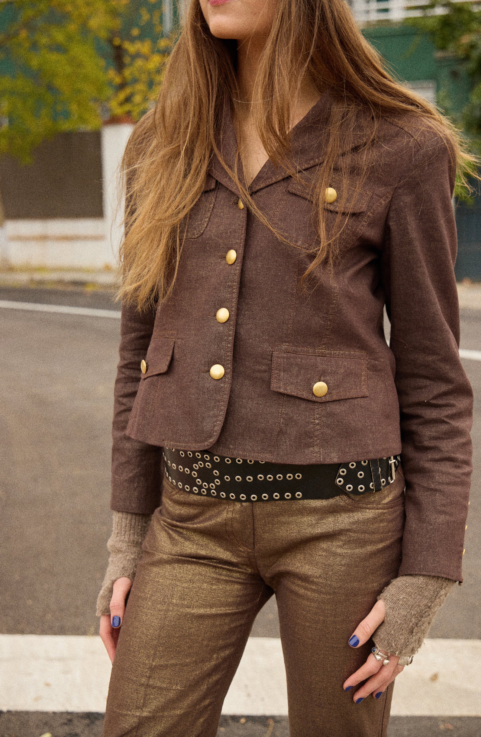 Conjunto traje americana corta y pantalón recto en tejido efecto metalizado bronze. Botonería dorada y estructura sastre.