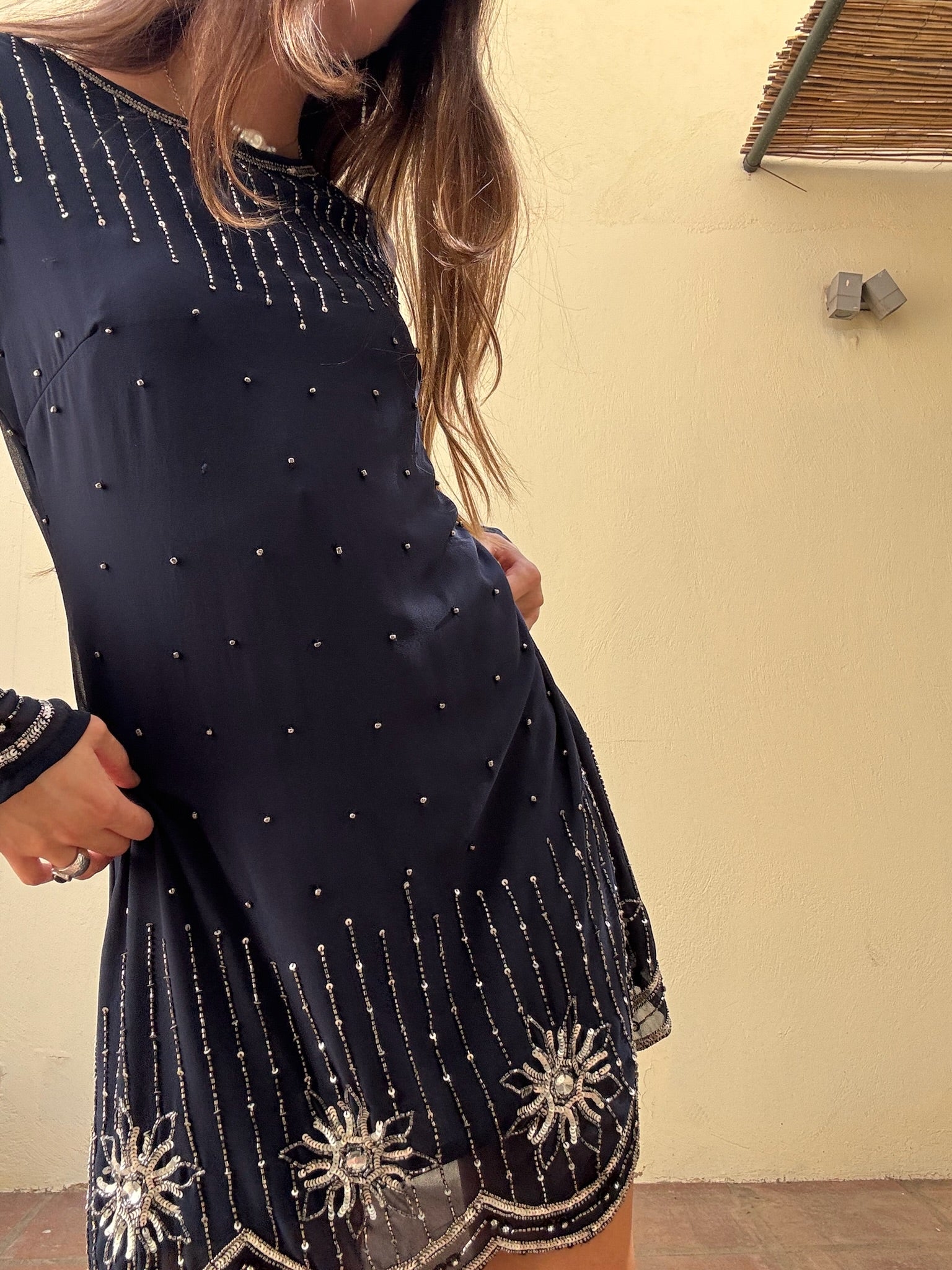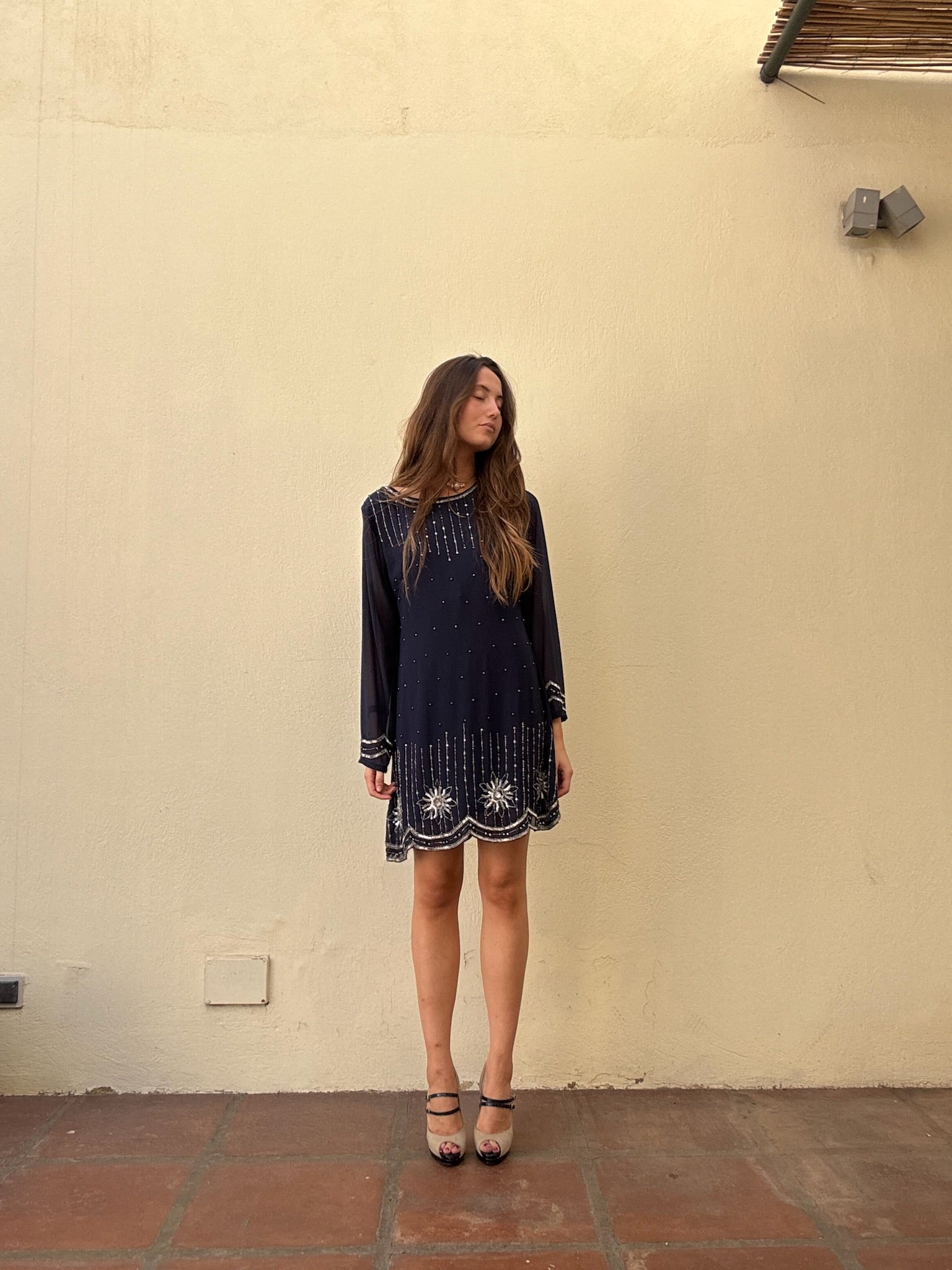 Vestido corto azul marino con cuello redondo, manga larga  detalle lentejuelas y abalorios.