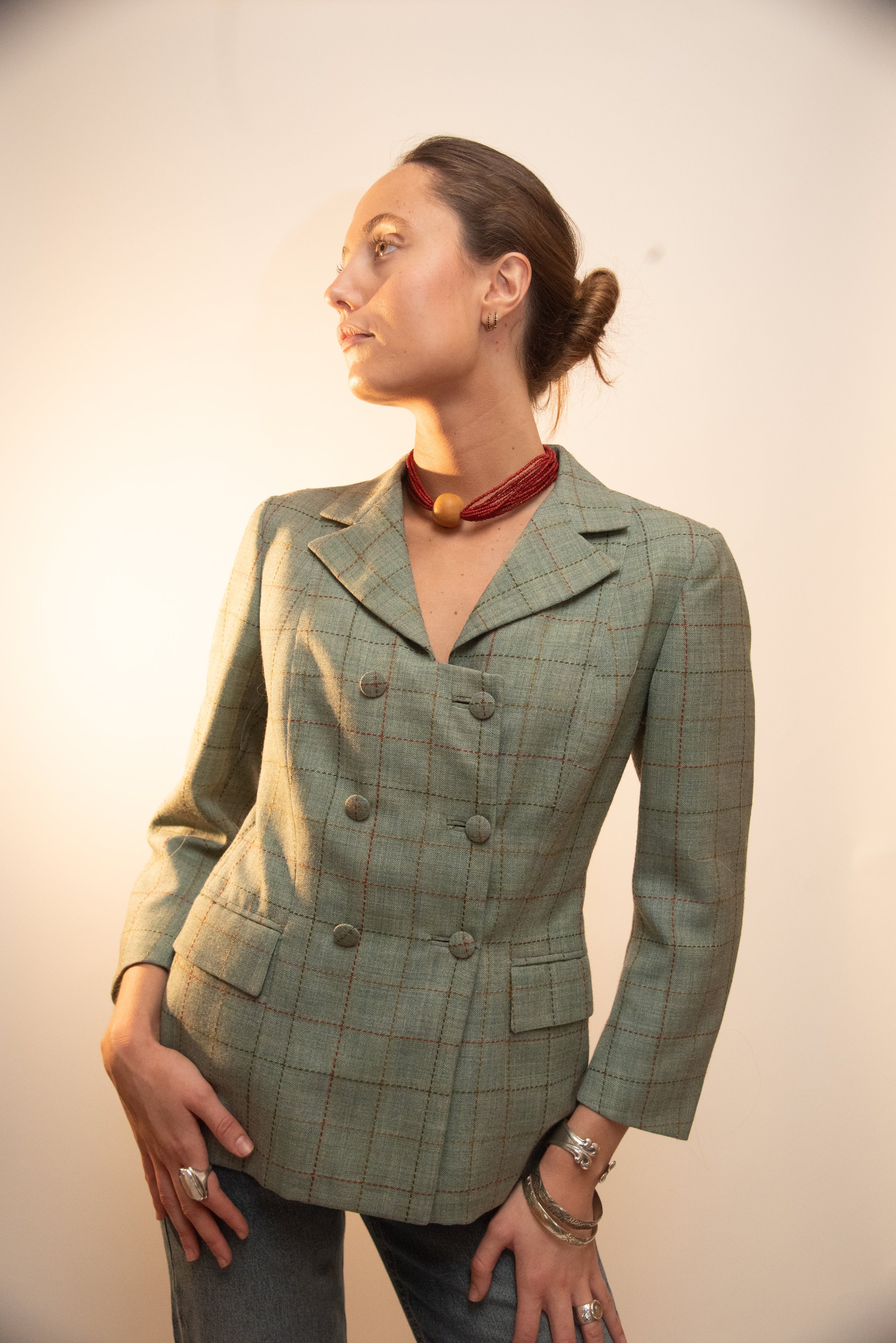 Blazer verde menta con patrón de cuadros finos y doble botonadura.