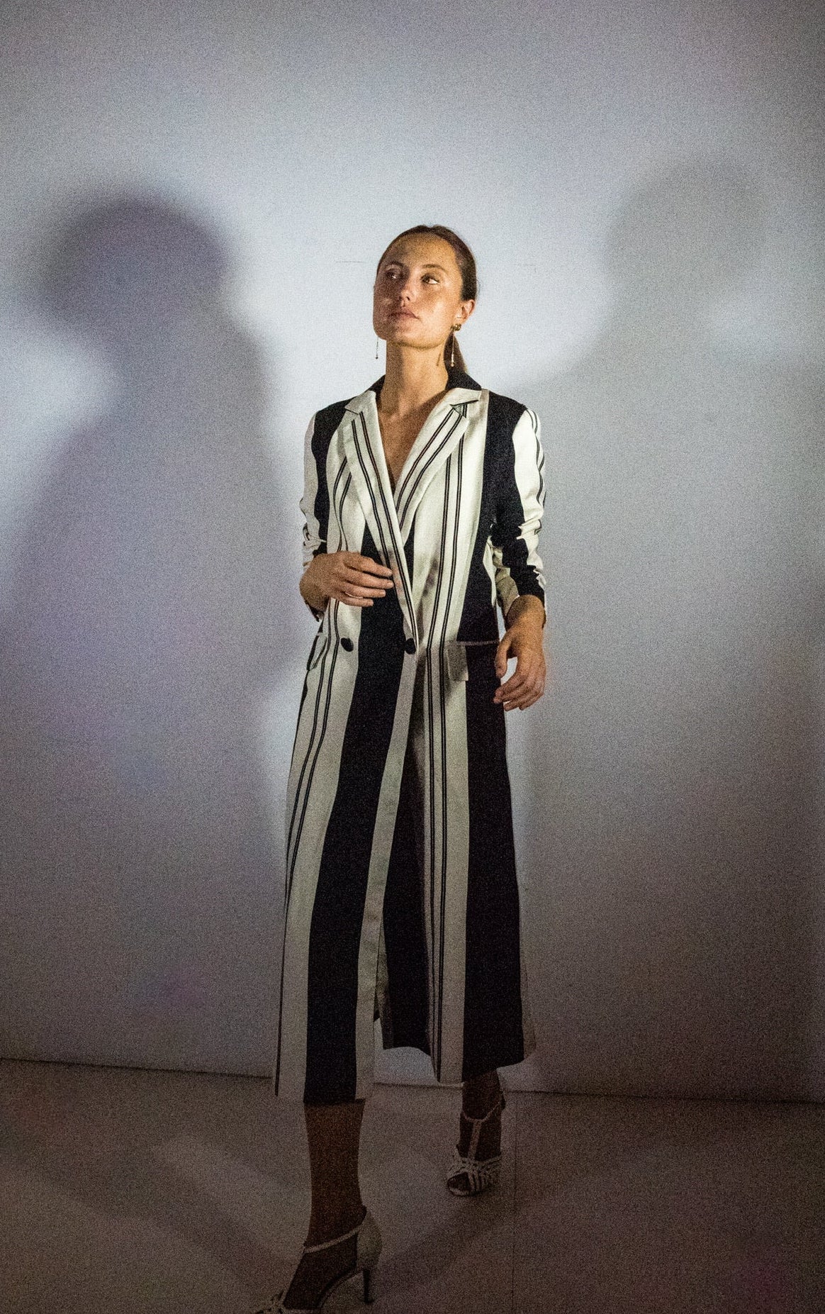 Abrigo ligero de corte sastre con doble botonadura y estampado de rayas verticales en blanco y negro.