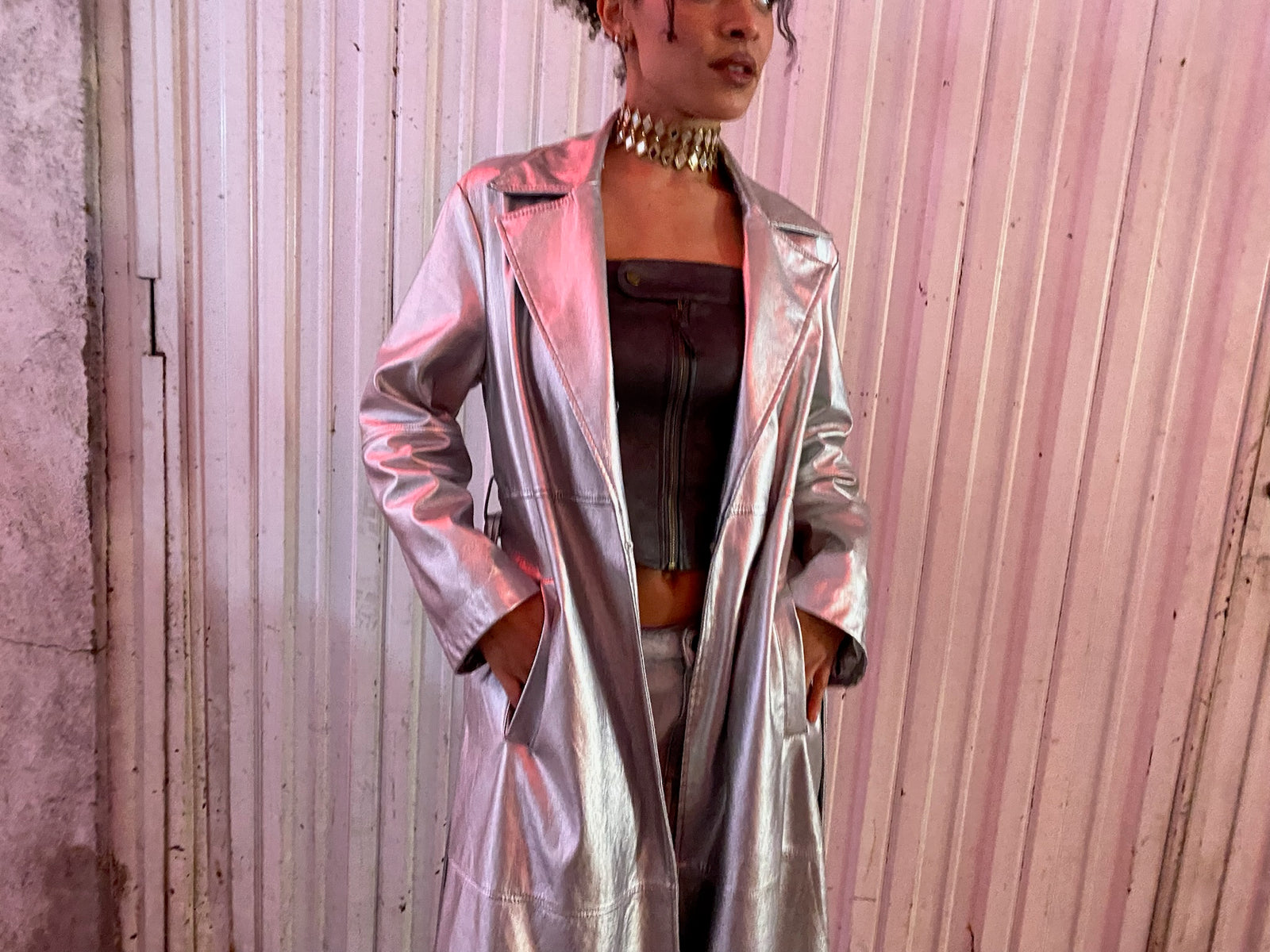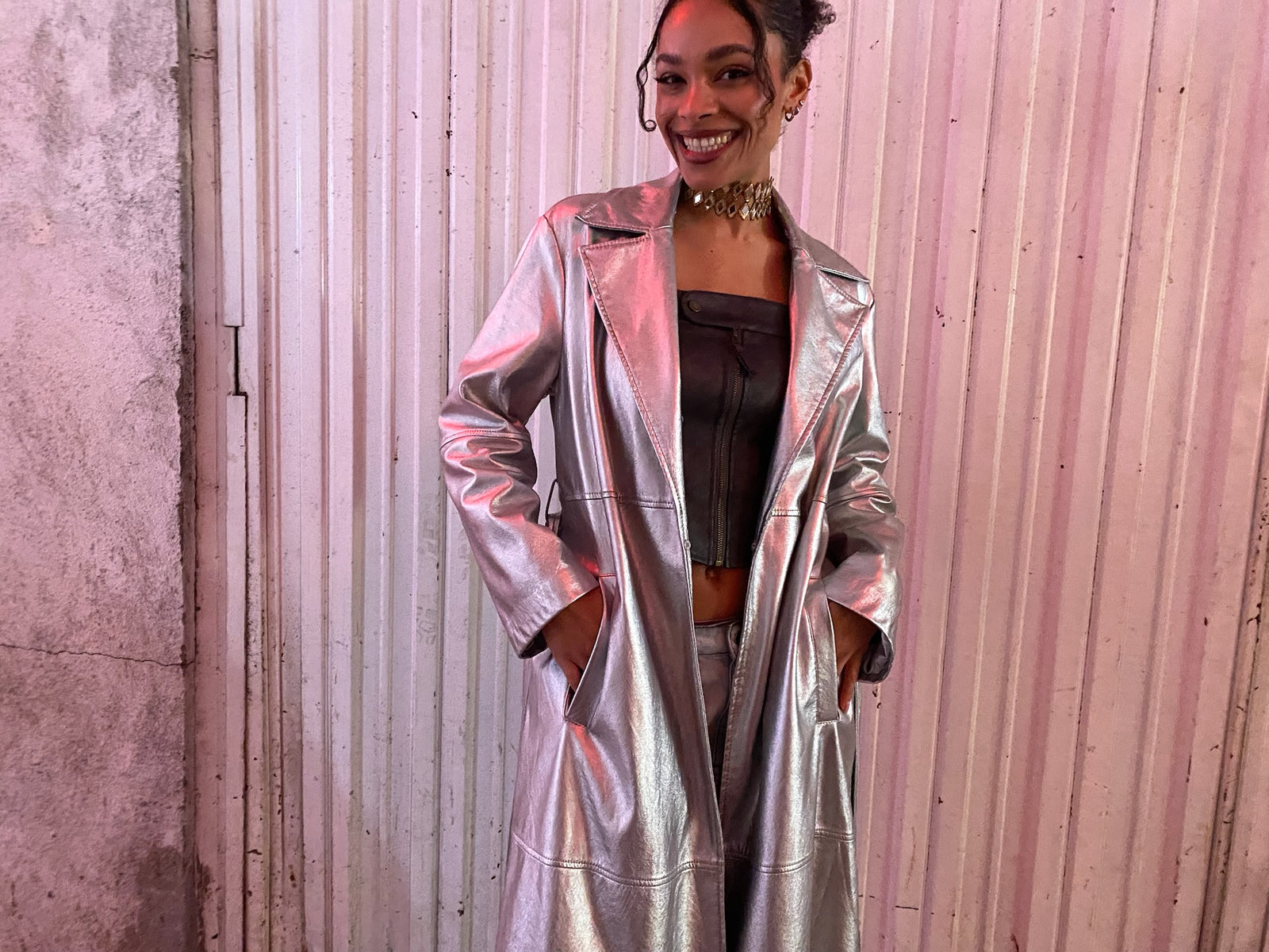 Gabardina midi plateada de piel, lazo en la cintura.