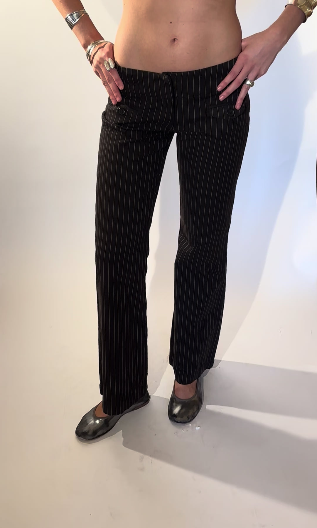 Pantalón marrón de tiro bajo con finas rayas beige y corte acampanado.