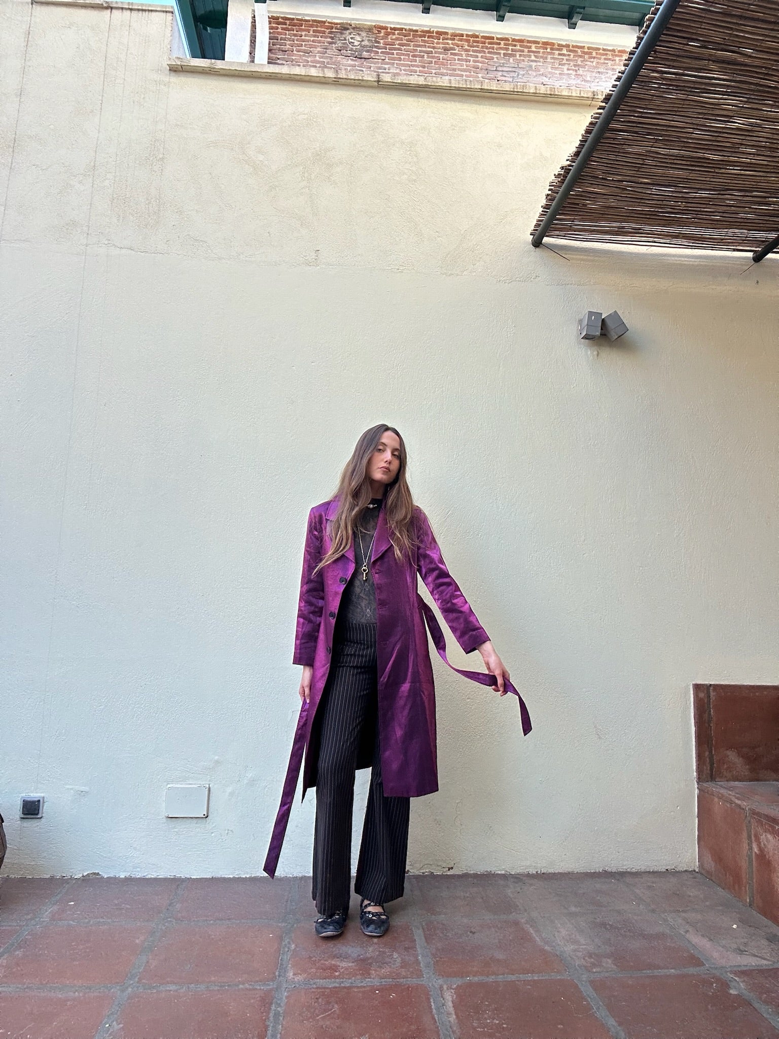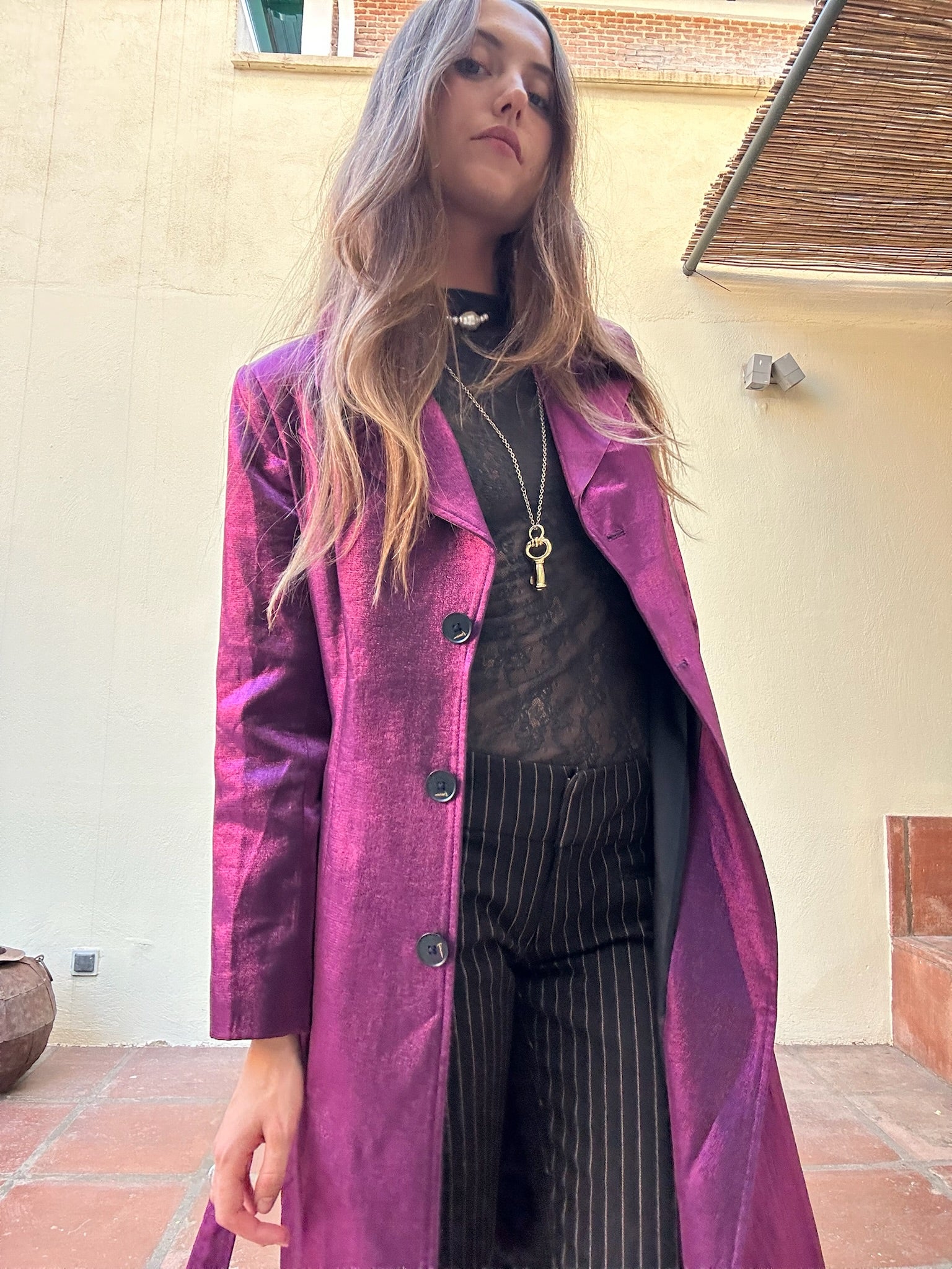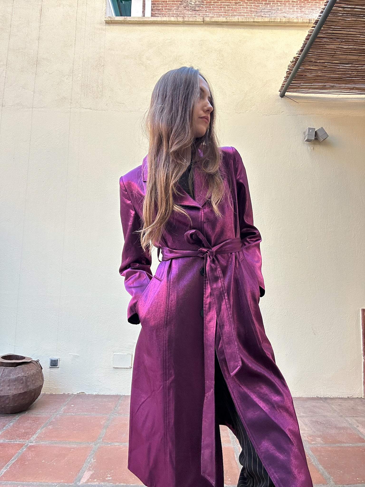 Gabardina larga con tejido fucsia y brillo metálico, cierre de botones y cinturón a juego.