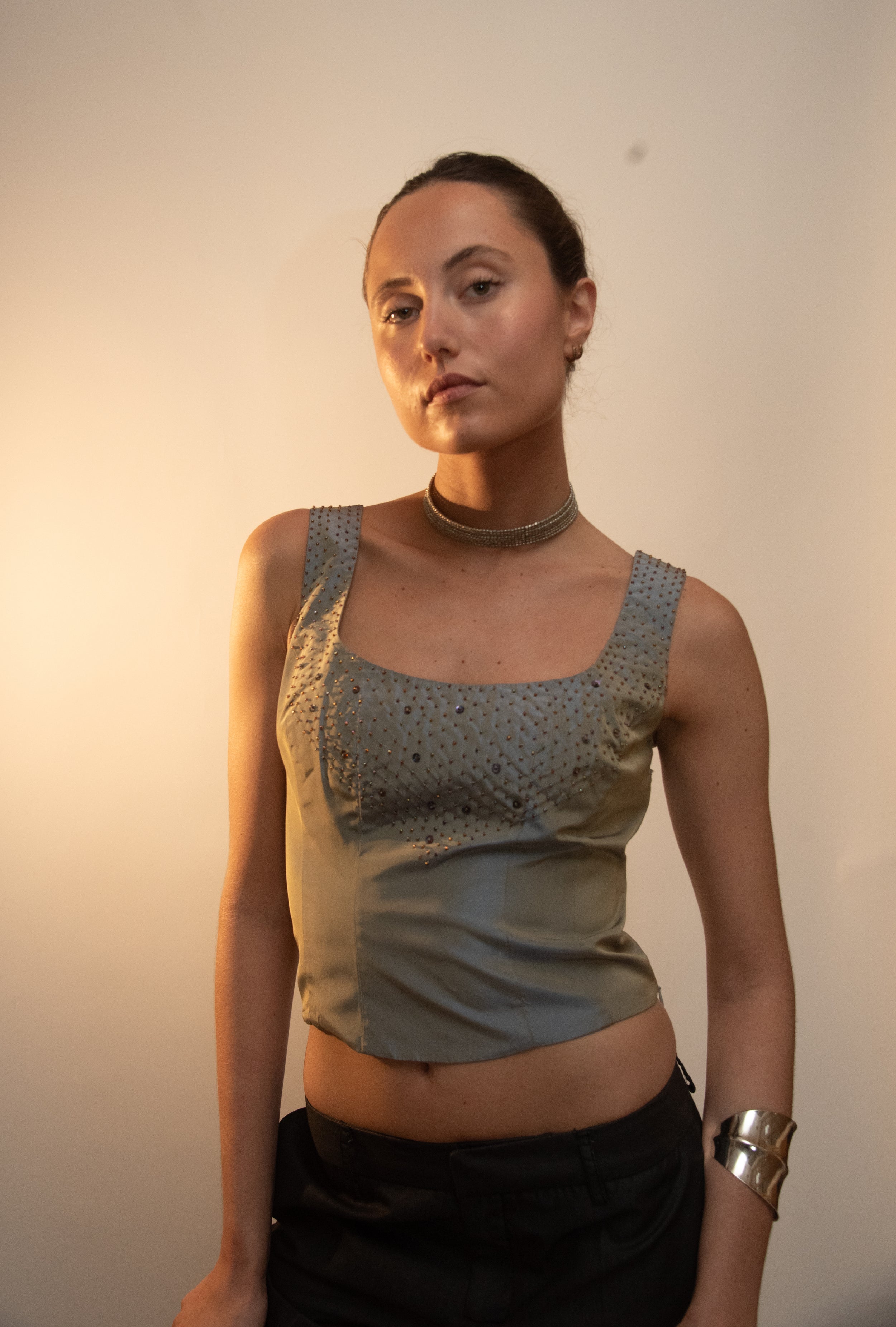 Top tipo corset en tono verde hielo con bordado de cristales y tirantes satinados.