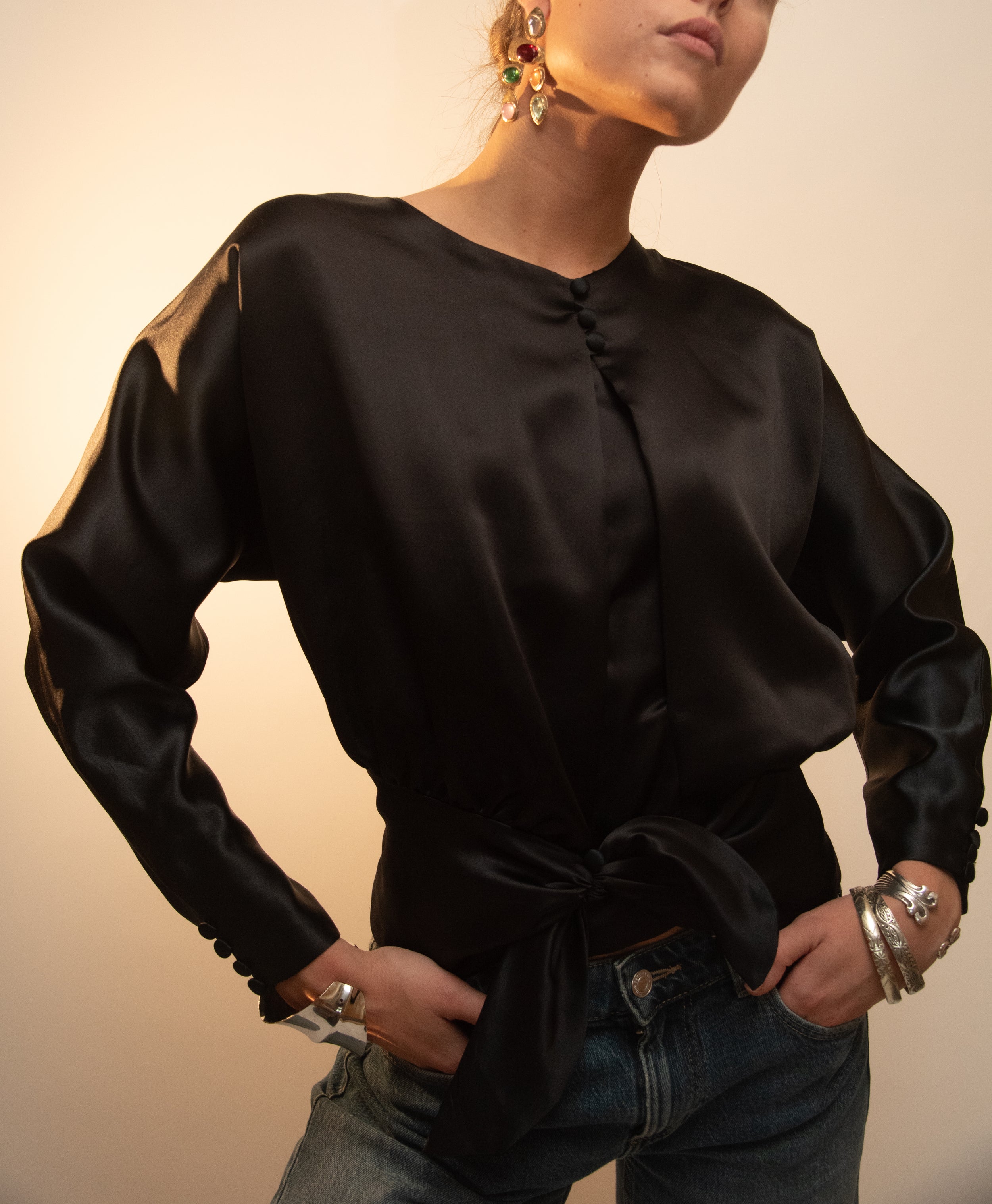 Camisa negra arreglada manga larga abullonada, con nudo en la cintura, cuello redondo.