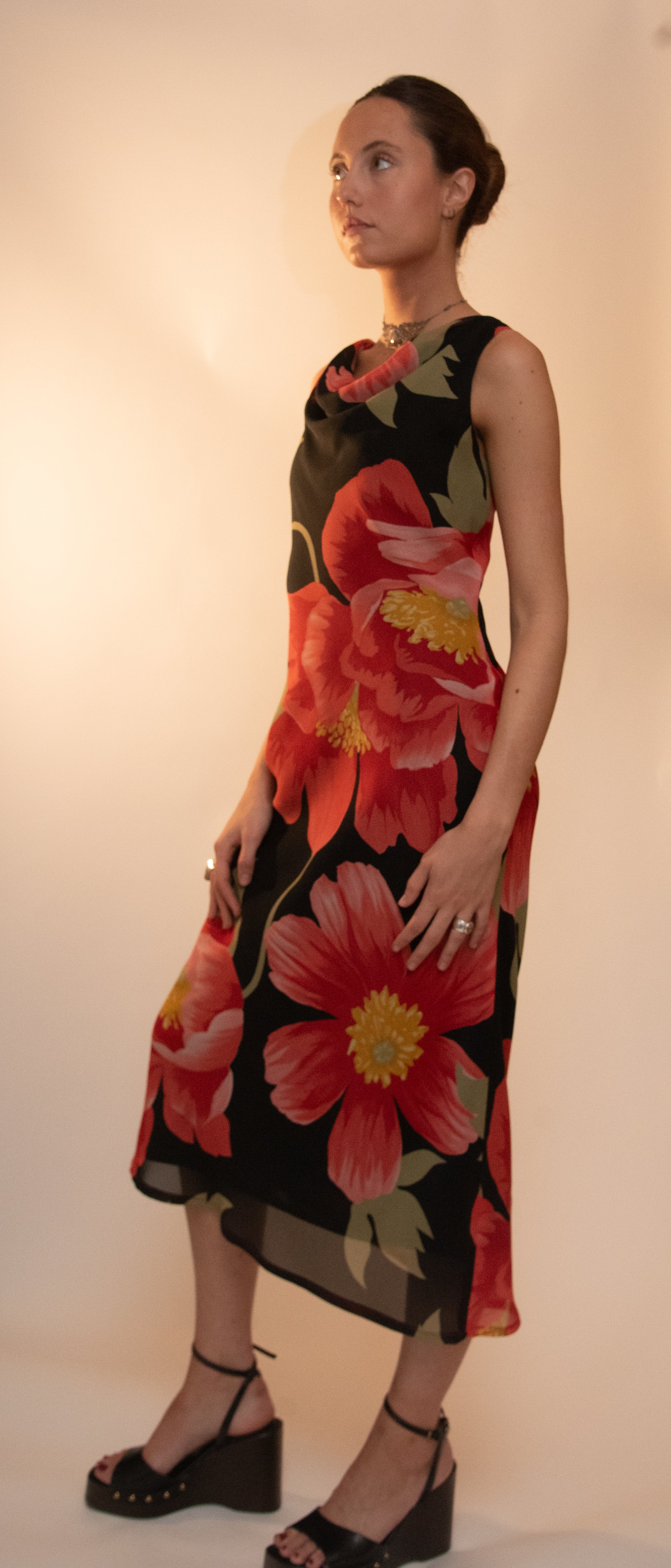 Vestido largo negro con flores en color rojo, cuello fluido, sin mangas.