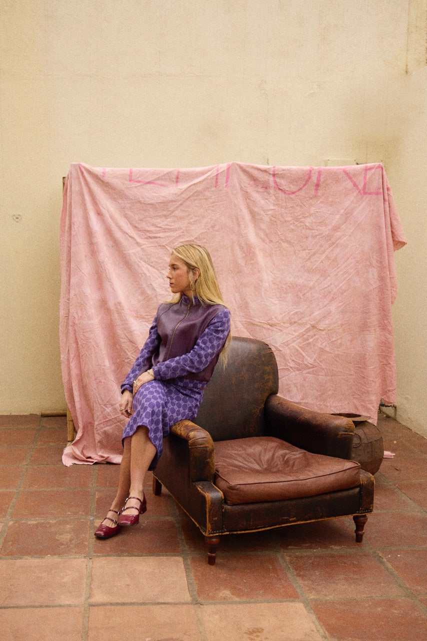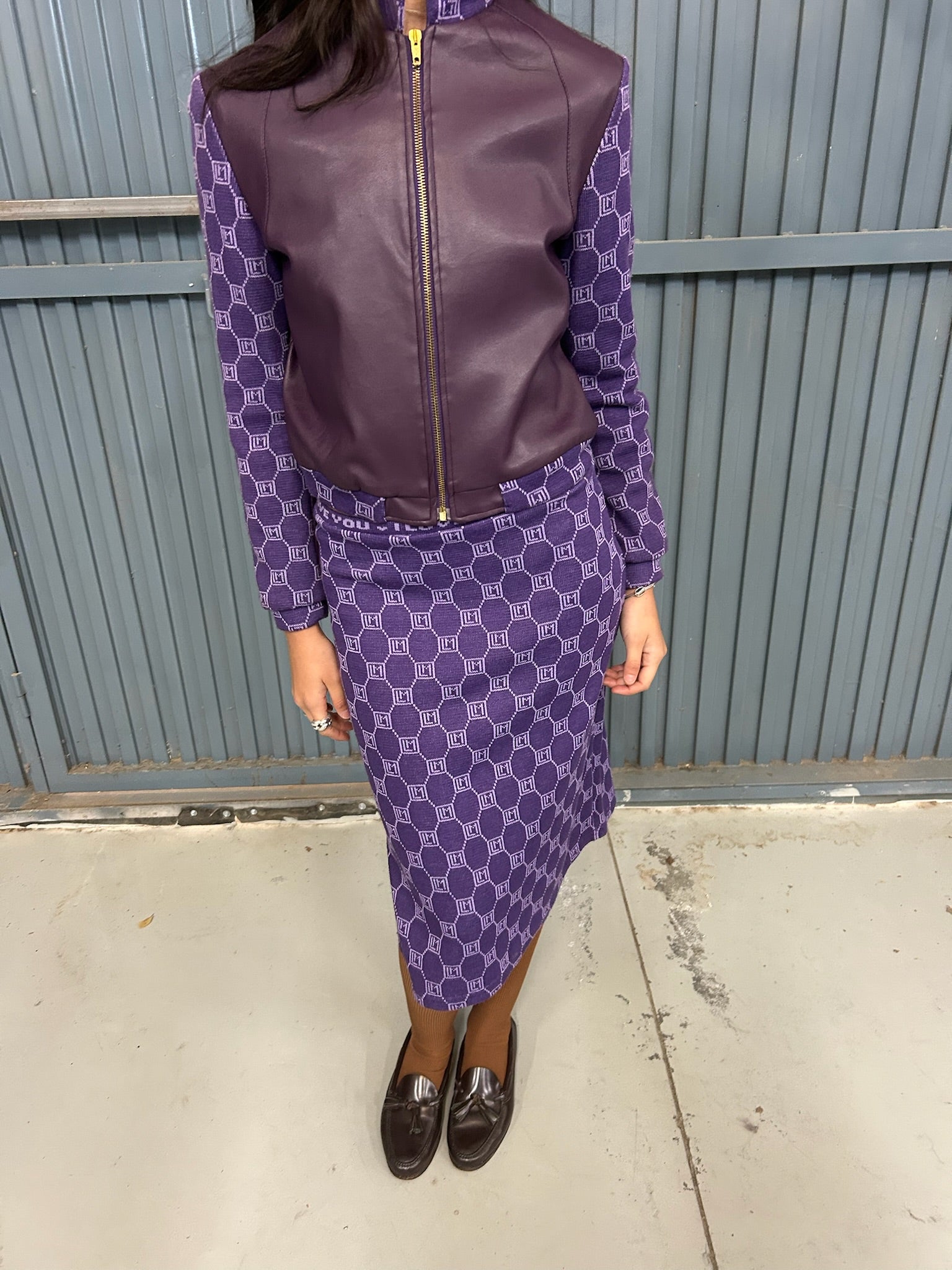 Conjunto estampado morado, de chaqueta de piel y punto, y falda ceñida de punto estampada.