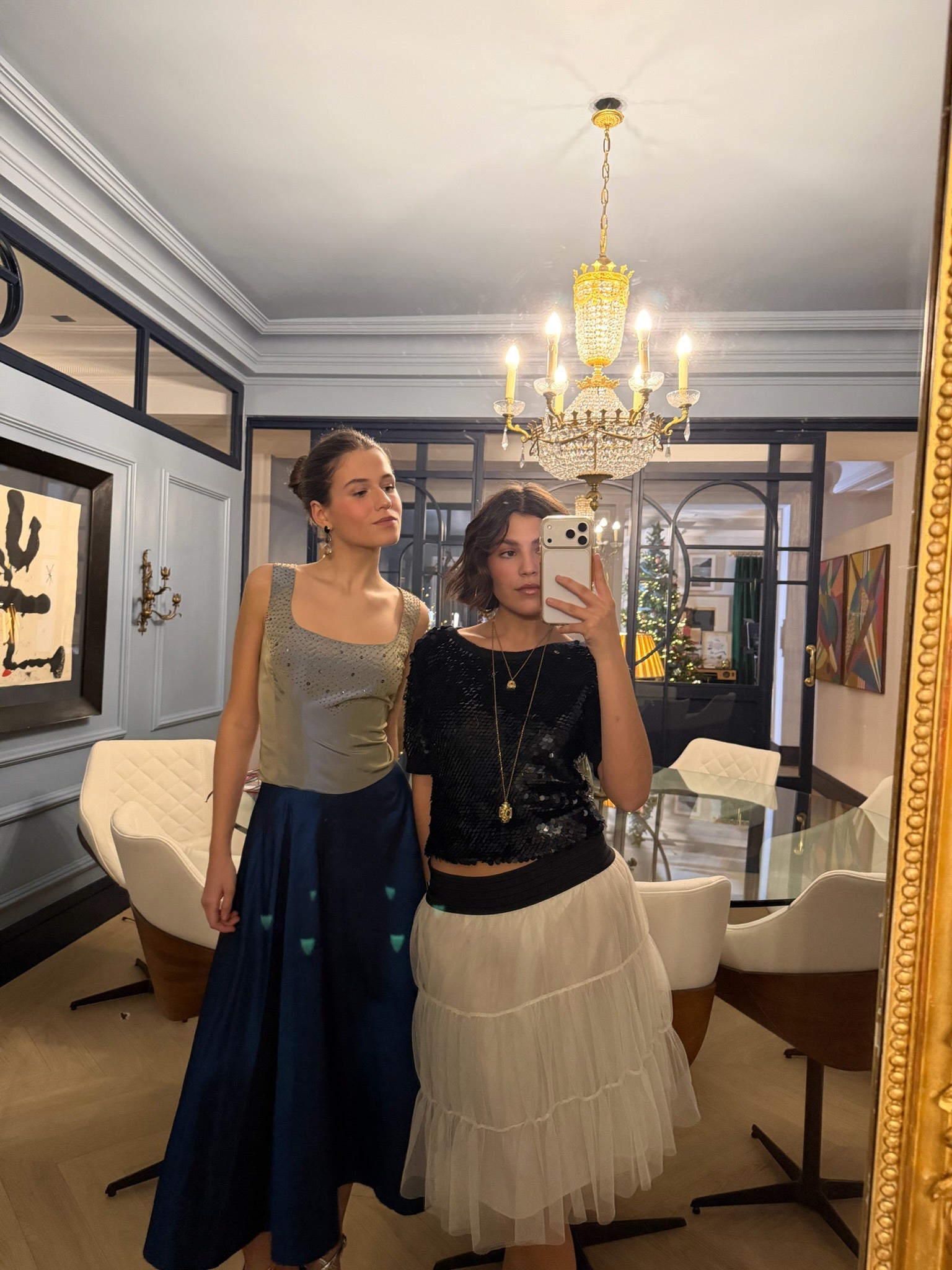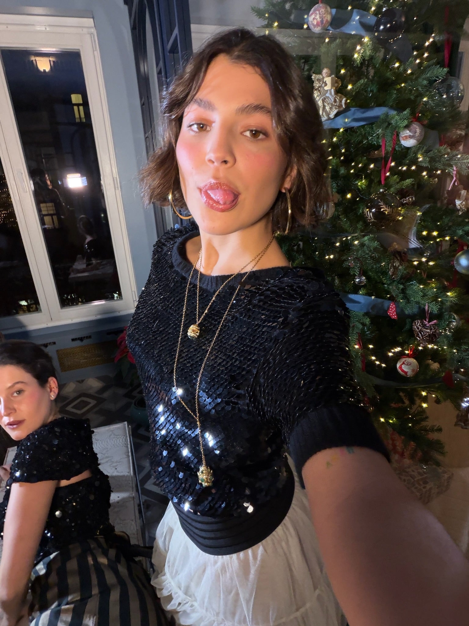 Top negro de lentejuelas con manga corta y cuello redondo.