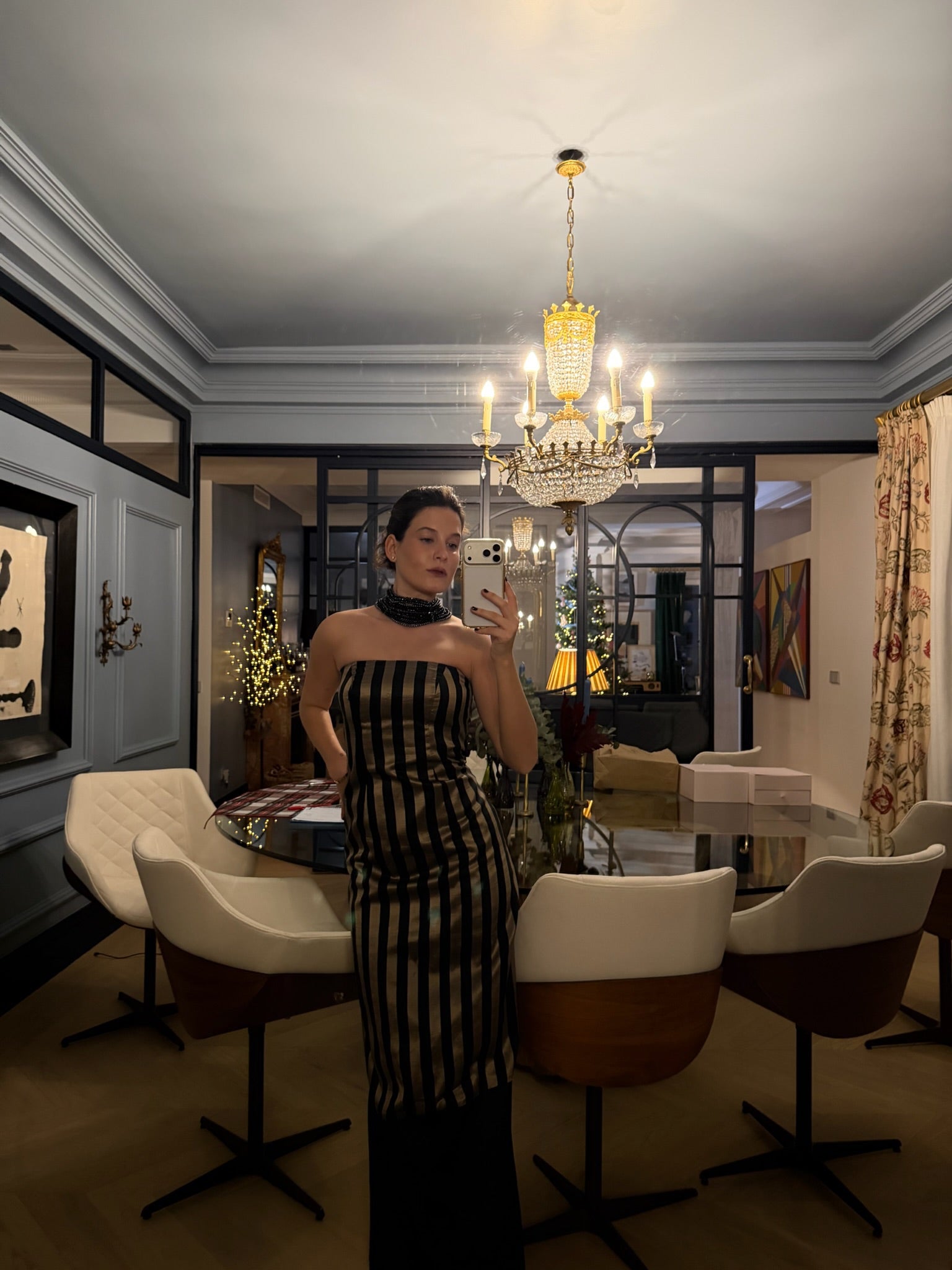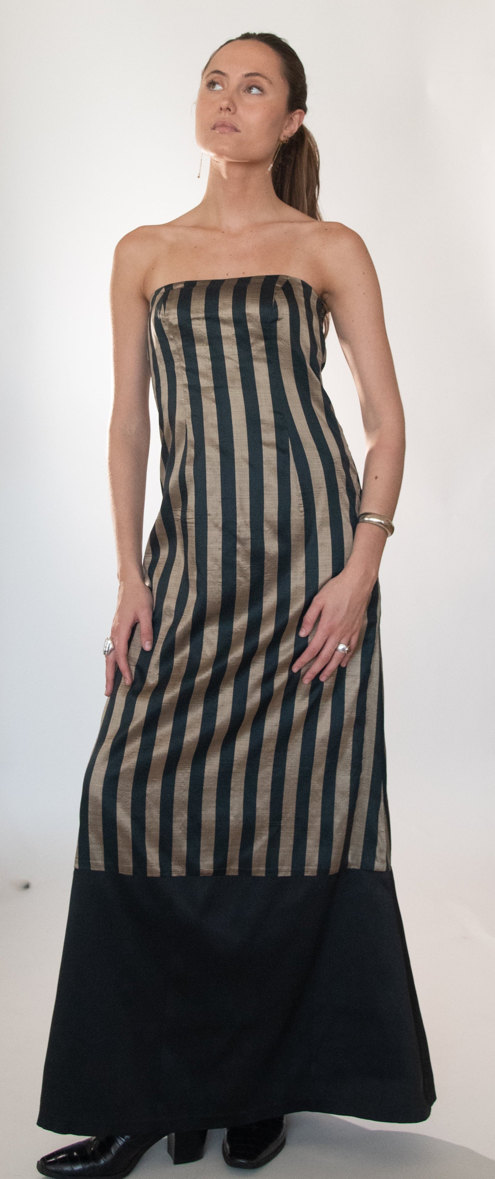 Vestido largo palabra de honor con rayas verticales doradas y negras y bajo liso.