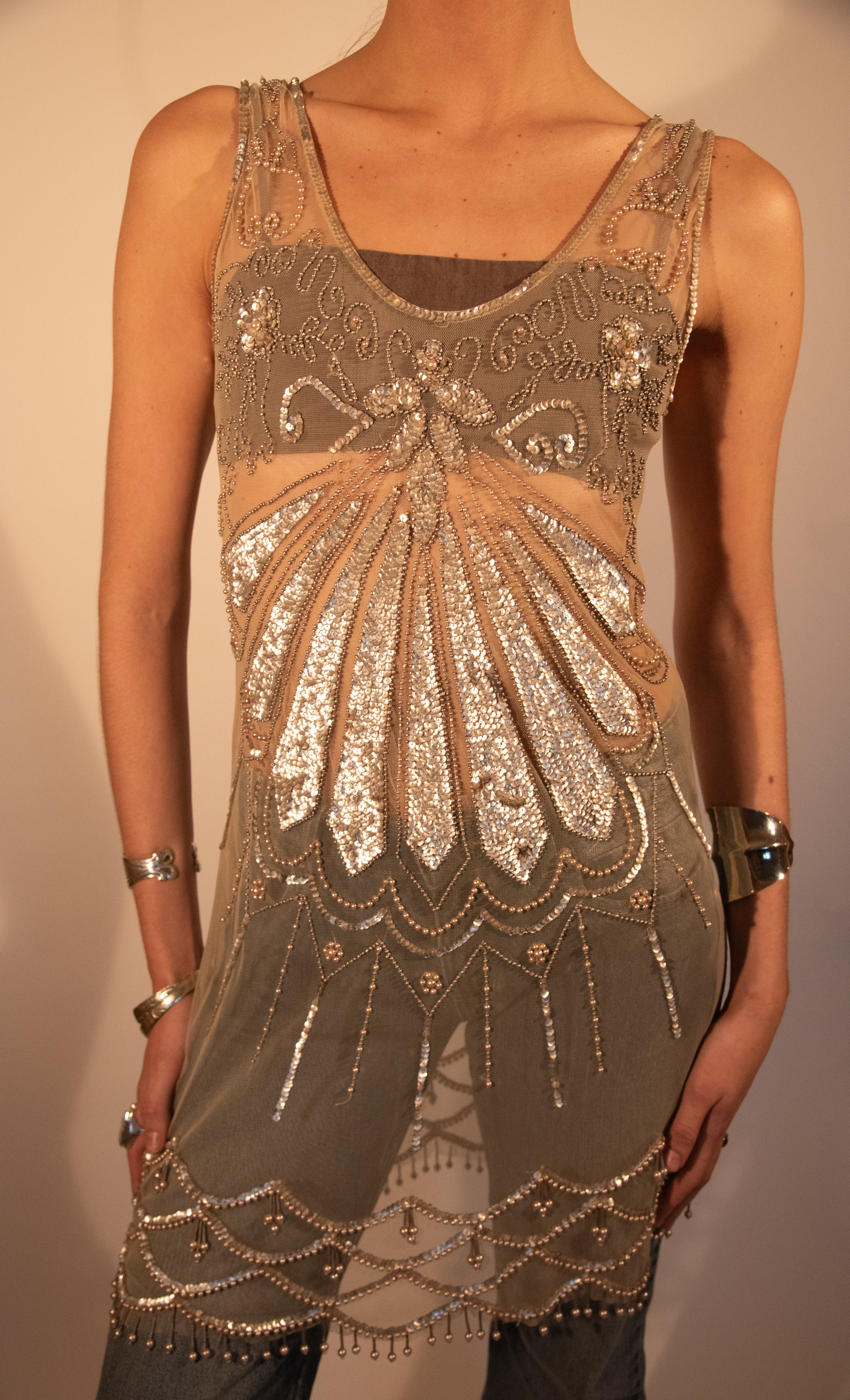 Vestido transparente con pedrería.