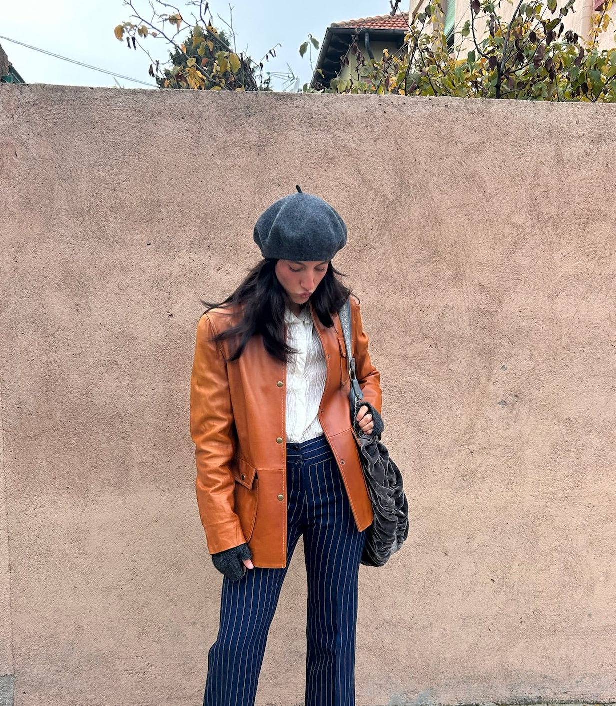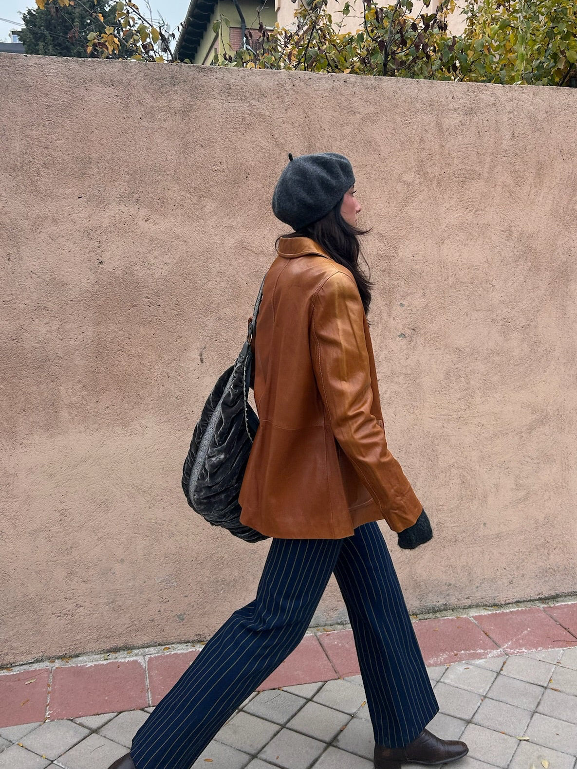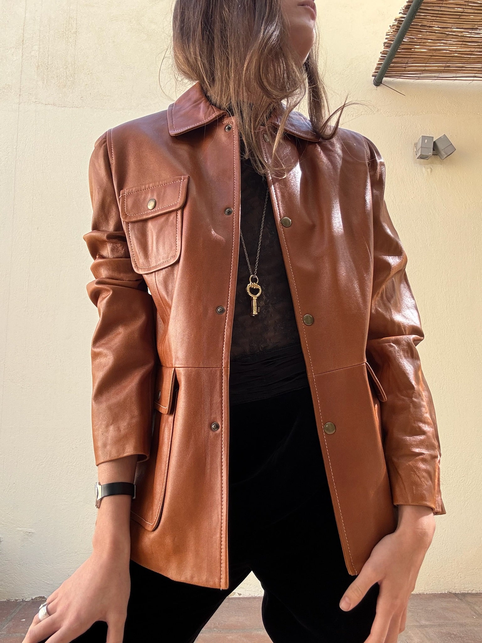 Cazadora de piel color caramelo con bolsillos frontales y botones metálicos.