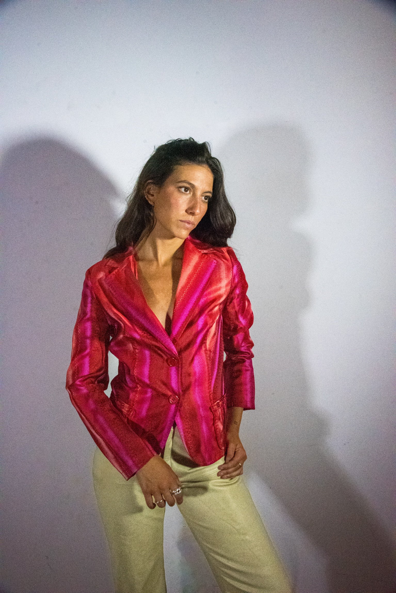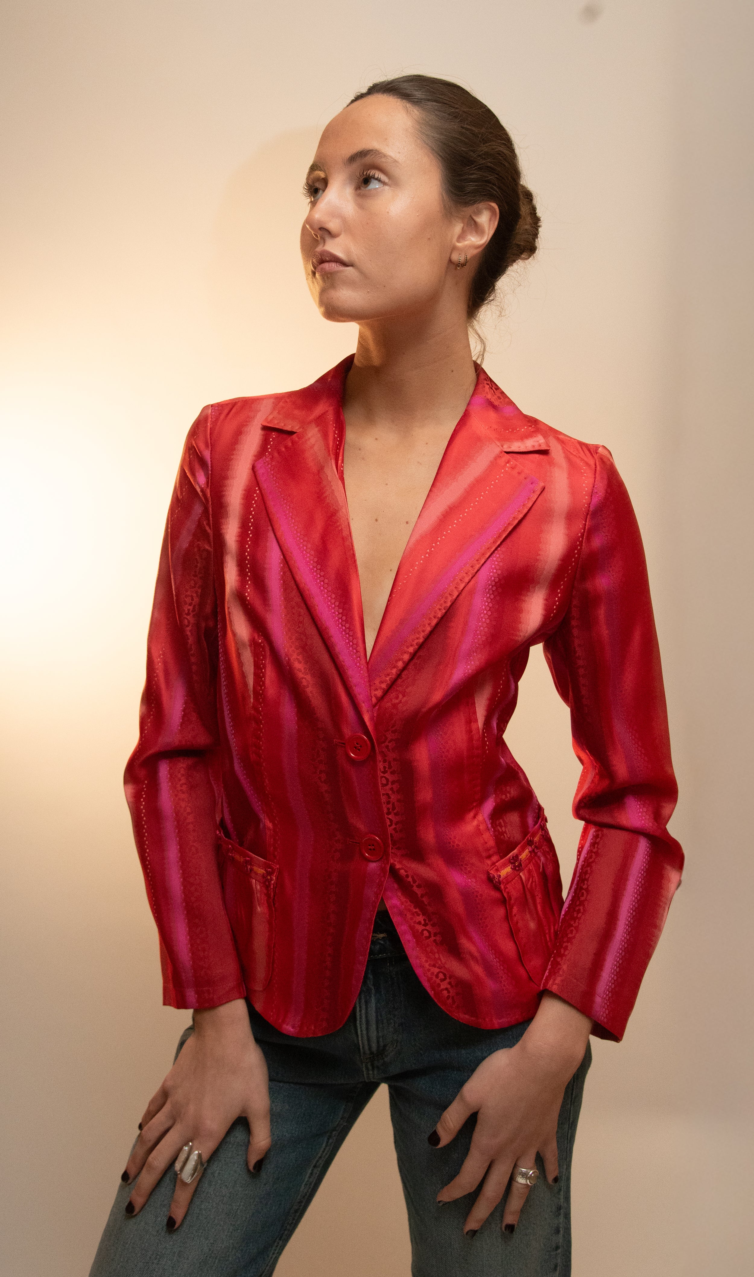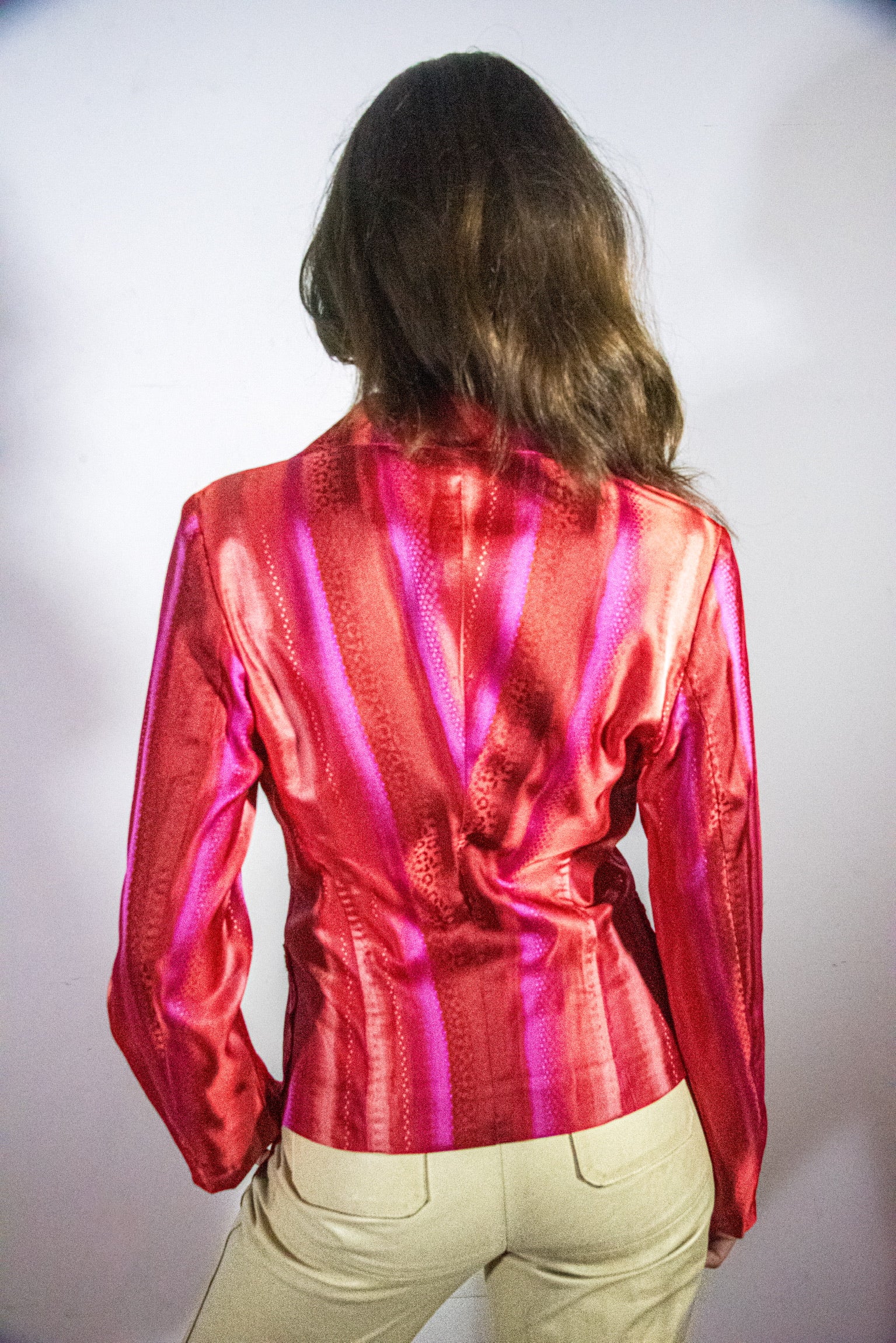 Blazer multicolor con flores en bolsillos. Colores rosa, naranja y rojo. Multicolor (rosa, naranja, rojo).