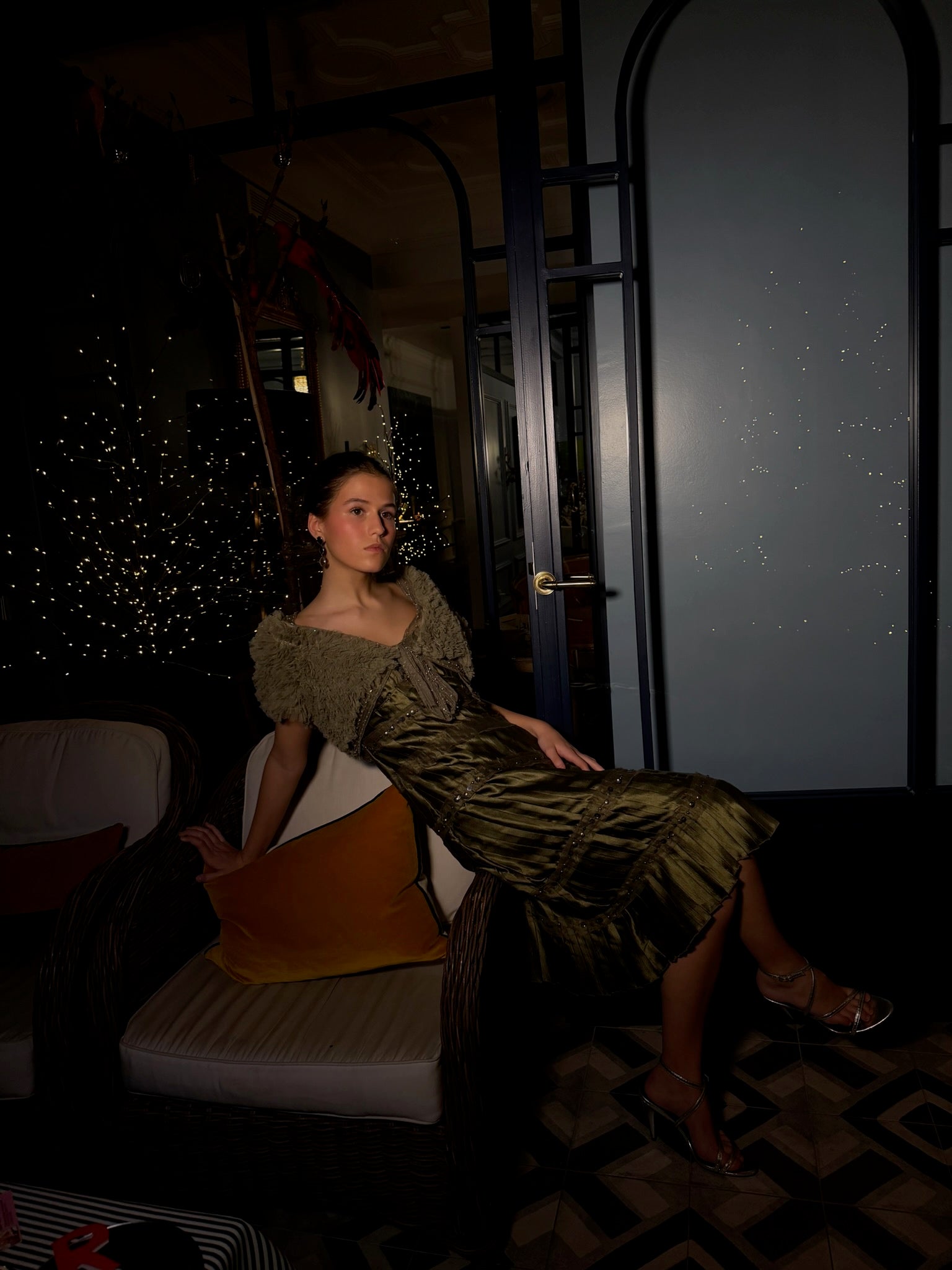 Vestido midi verde oliva con tirantes finos, plisados y detalles de lentejuelas.