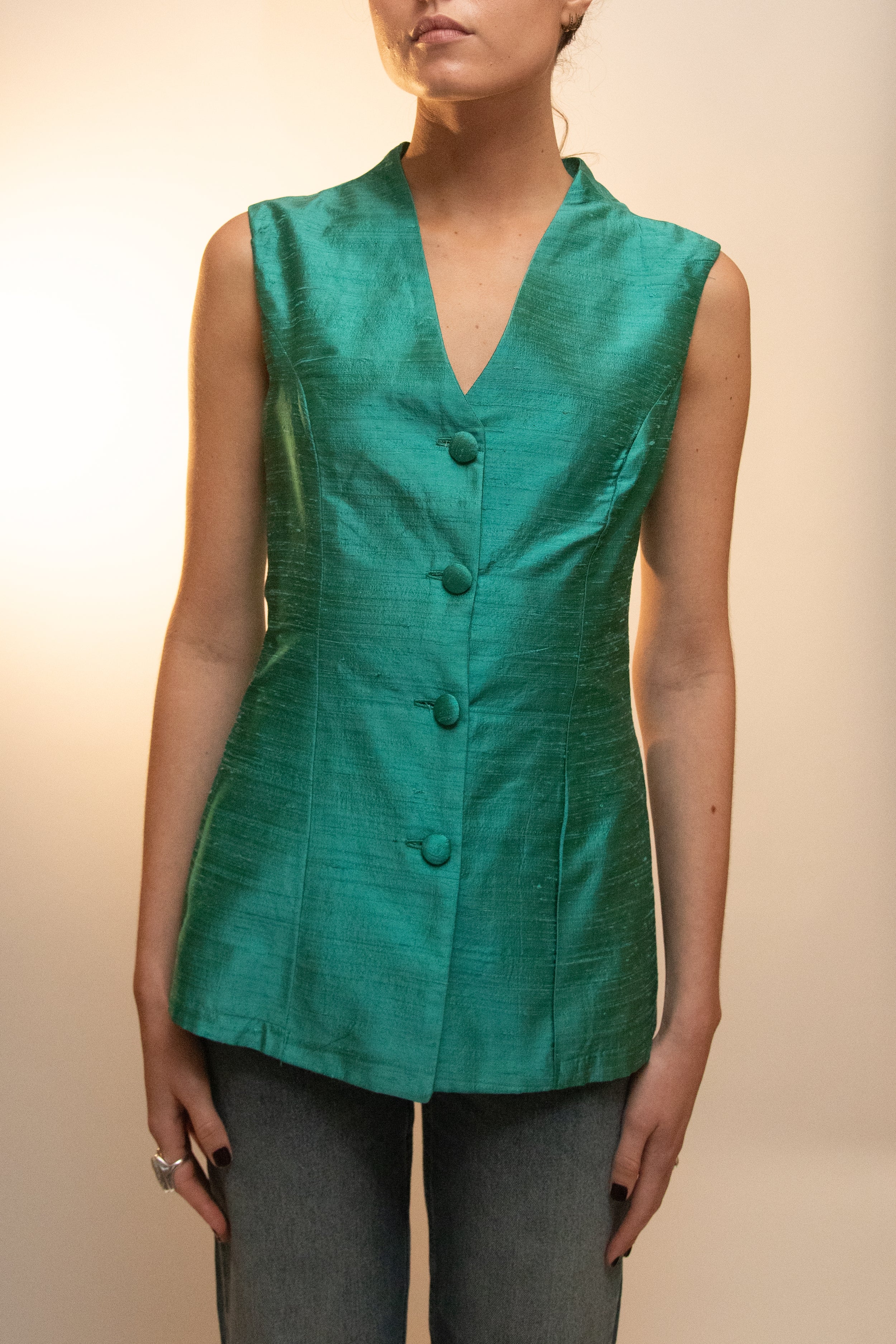 Chaleco/top sin mangas hecho a mano, seda jaspeada verde.