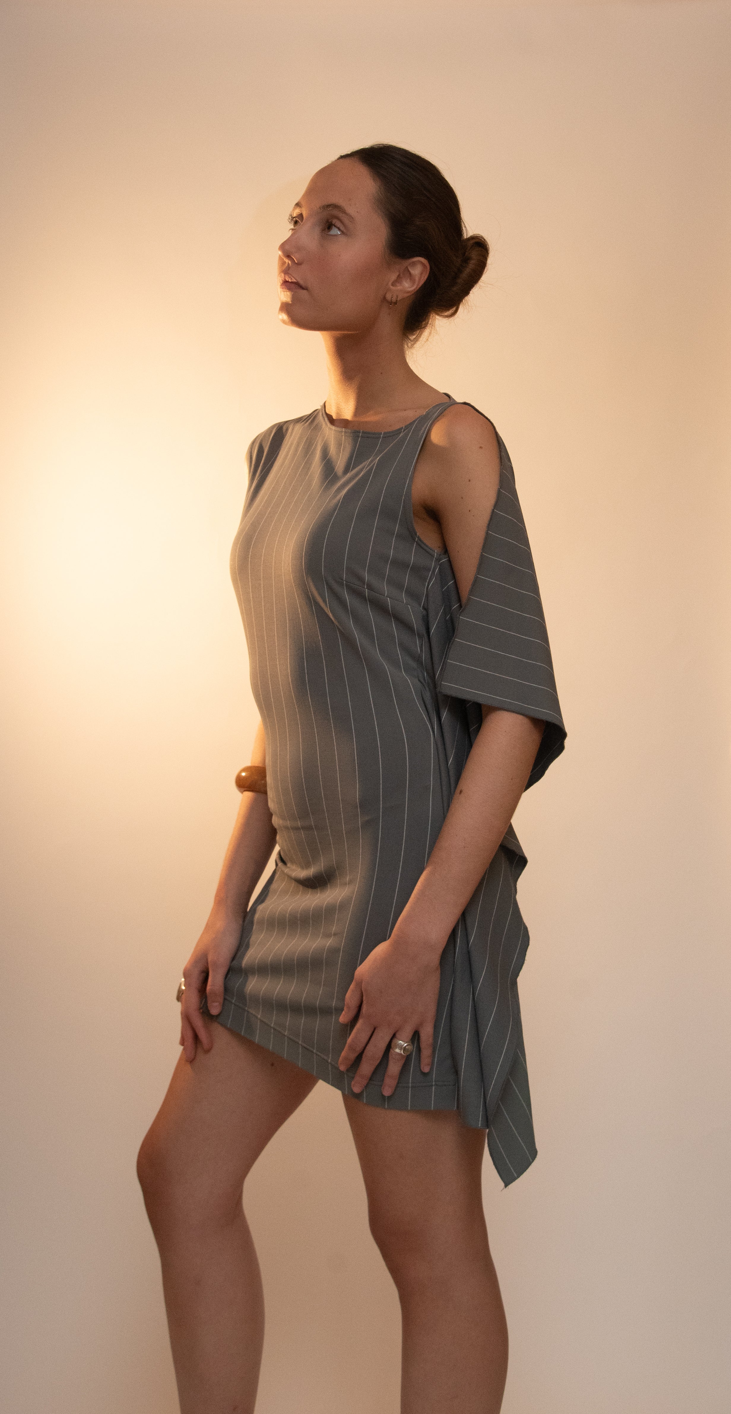 Vestido corto gris con finas rayas y capa lateral integrada.
