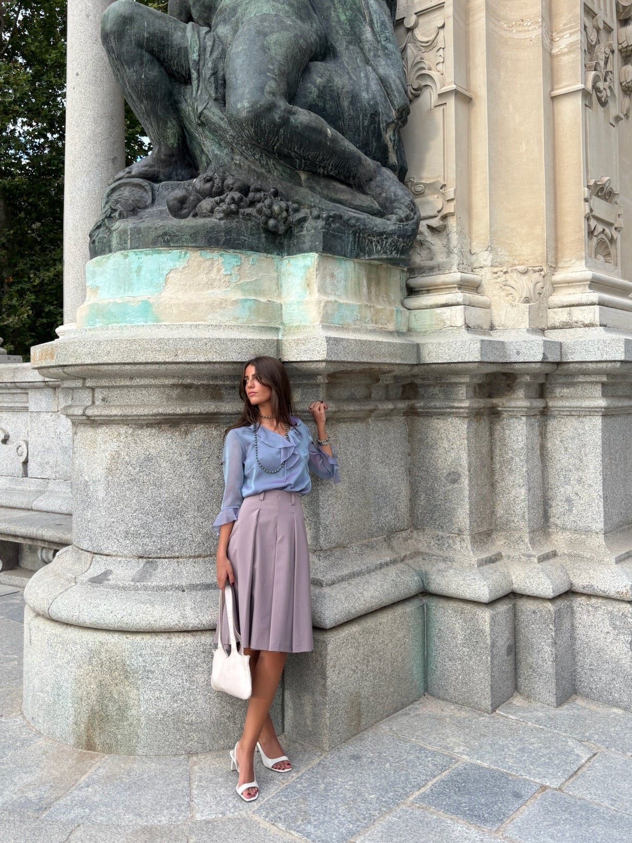 Camisa lila manga larga, con detalle de volantes en cuello y mangas.