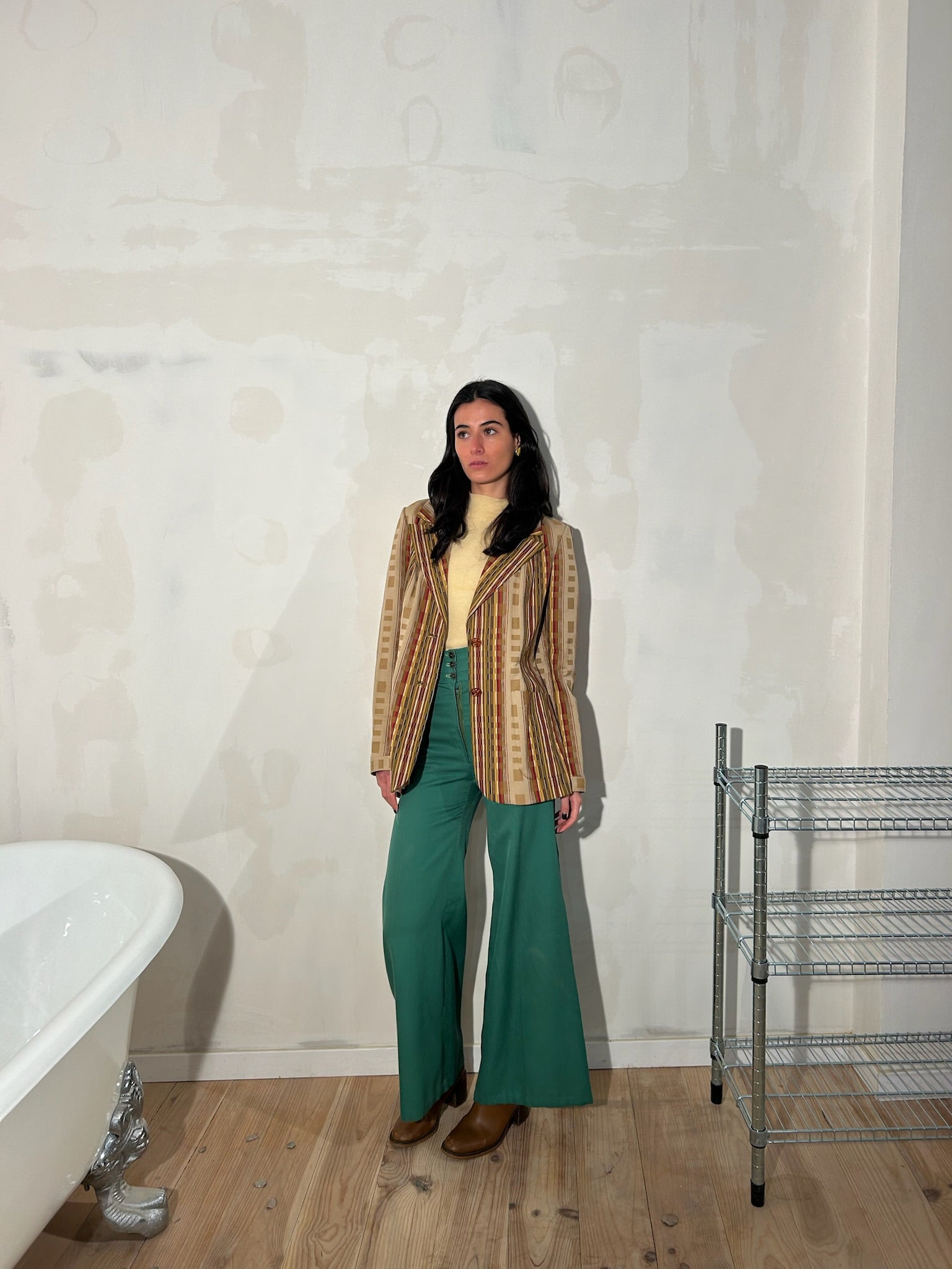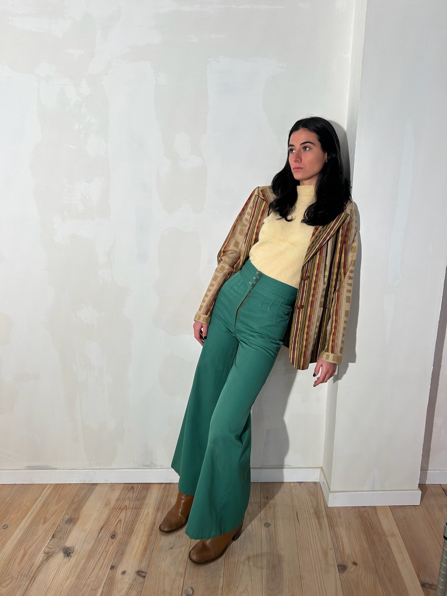 Pantalón original de los 70 de tiro alto en tejido verde. Cierre frontal con cremallera oculta y botones en la cinturilla. Silueta recta de pernera ancha. Cintura estructurada con pliegues delanteros y costura central marcada.