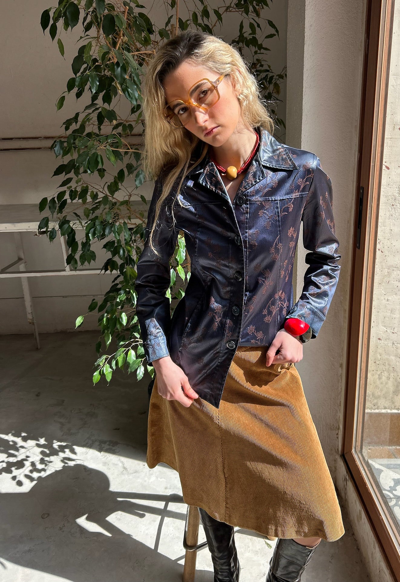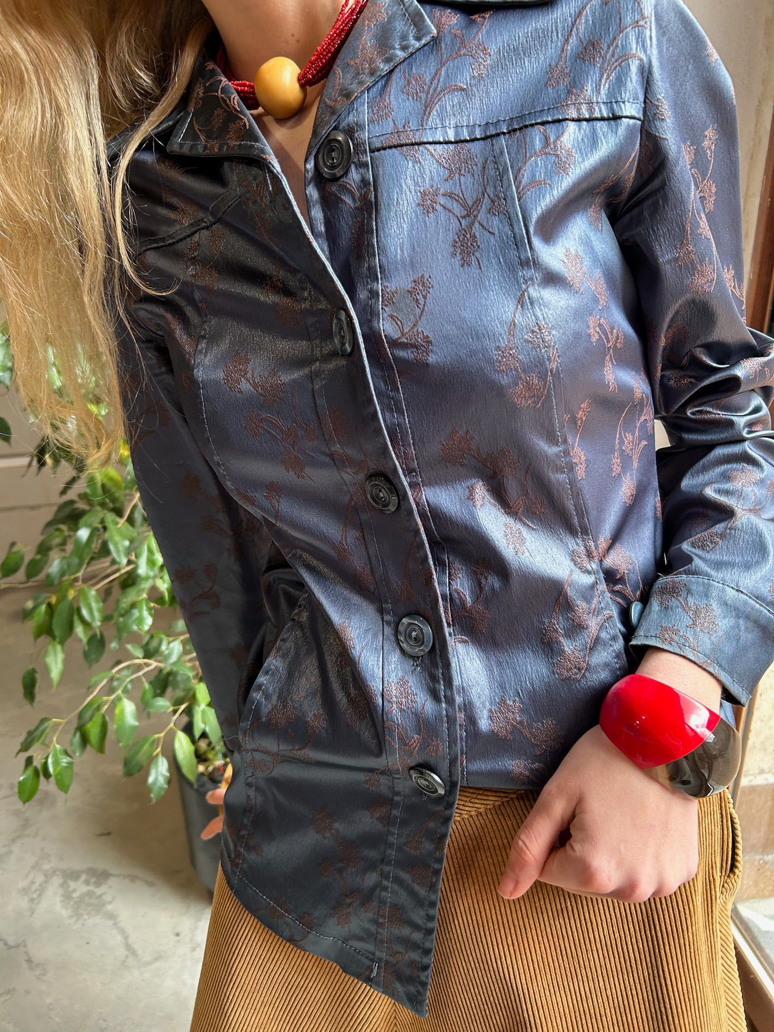 Camisa original de los 70 camisa efecto cuero con estampado floral de manga larga con acabado efecto cuero en tono azul y estampado floral sutil. Presenta cuello clásico, cierre frontal con botones y puños abotonados.