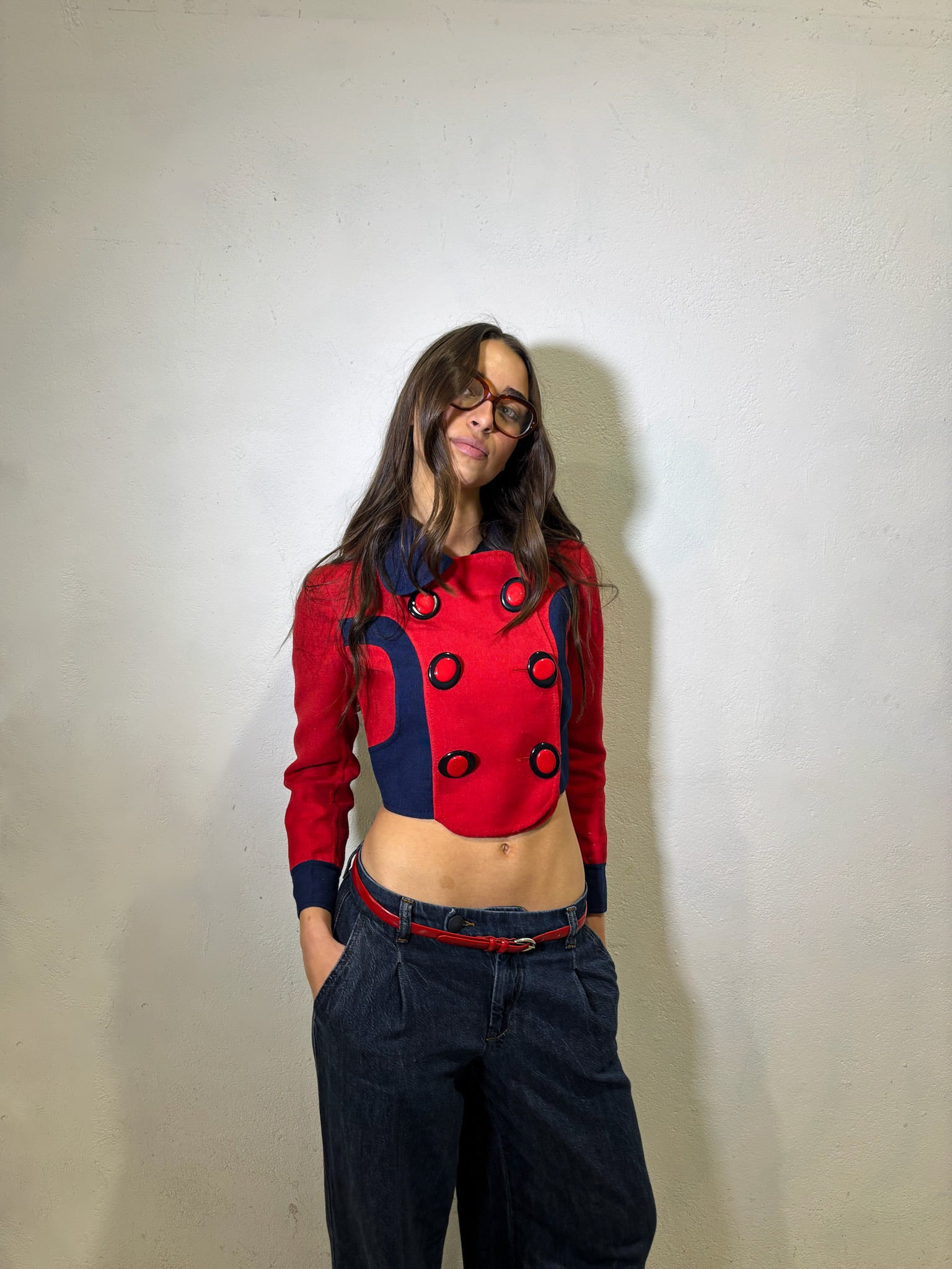 Chaqueta original de los 70 en rojo intenso con detalles en azul marino en cuello, bajo y puños. Cuello redondeado y cierre frontal con seis botones decorativos circulares. Largo a la cintura con bajo ligeramente curvado.