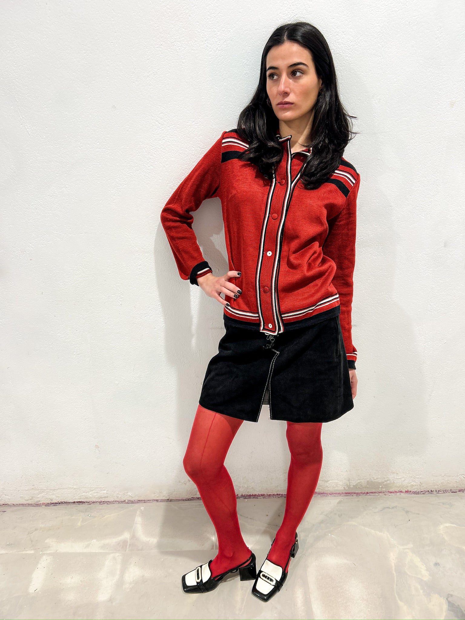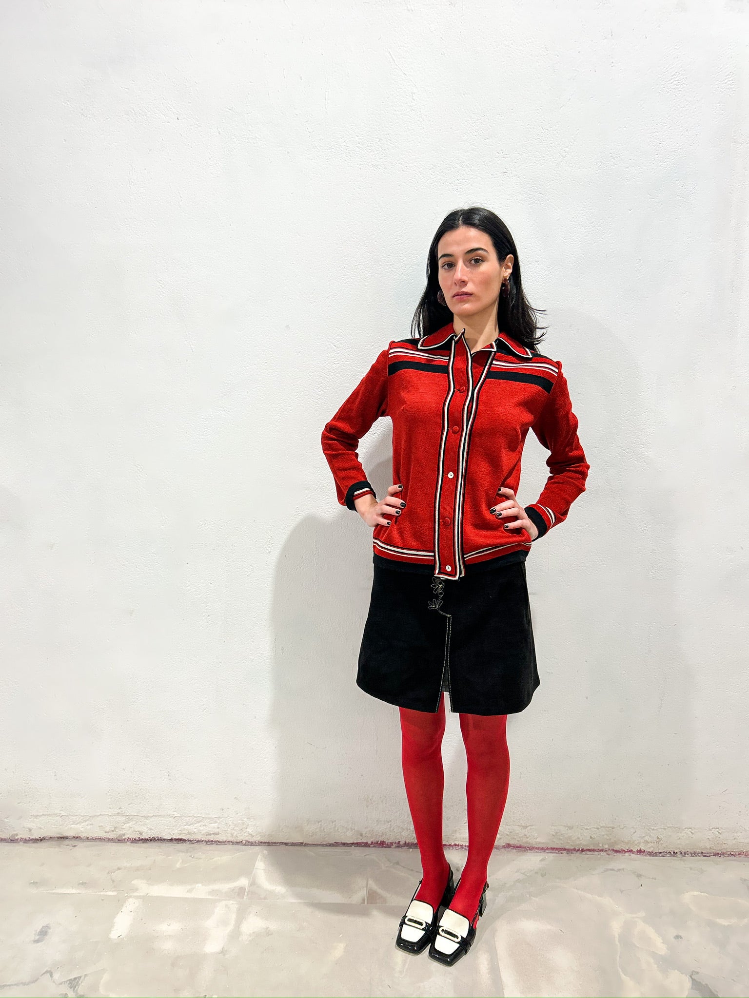 Falda original de los 70 en tono negro con corte en línea A y largo por encima de la rodilla. Cinturilla recta y cierre lateral mediante cremallera metálica visible y botón en la parte superior. Costura central frontal con abertura y detalle bordado lineal en contraste.
