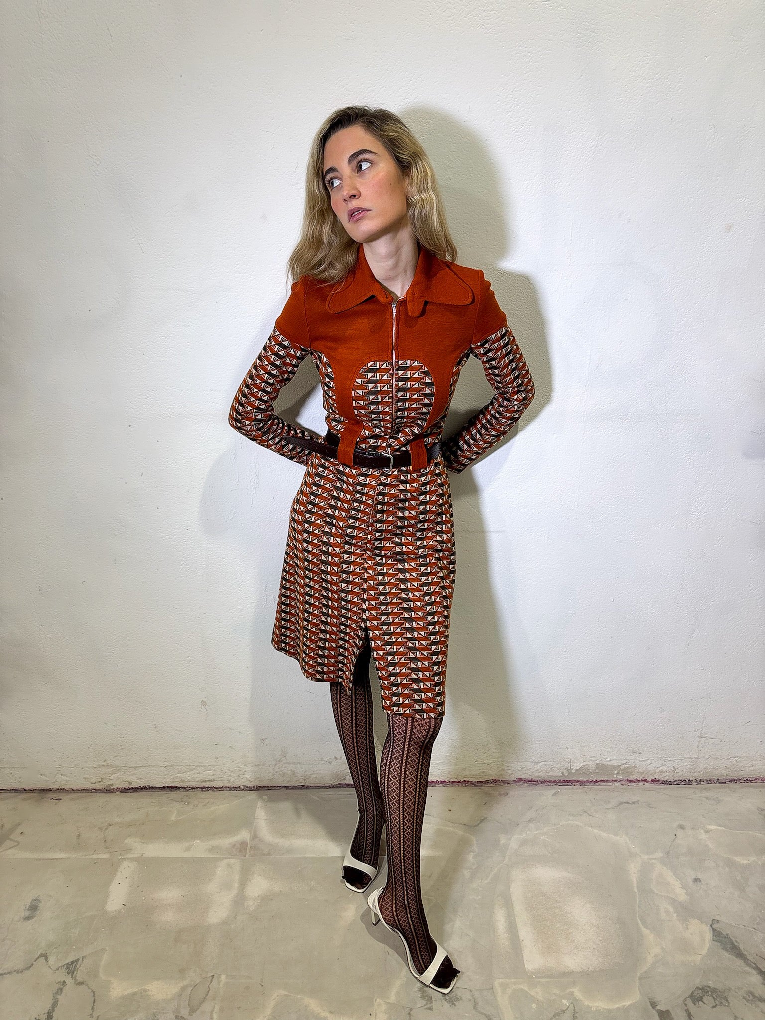 Vestido original de los 70 midi, con estampado retro y detalle para meter el cinturón. En colores naranjas y marrones.