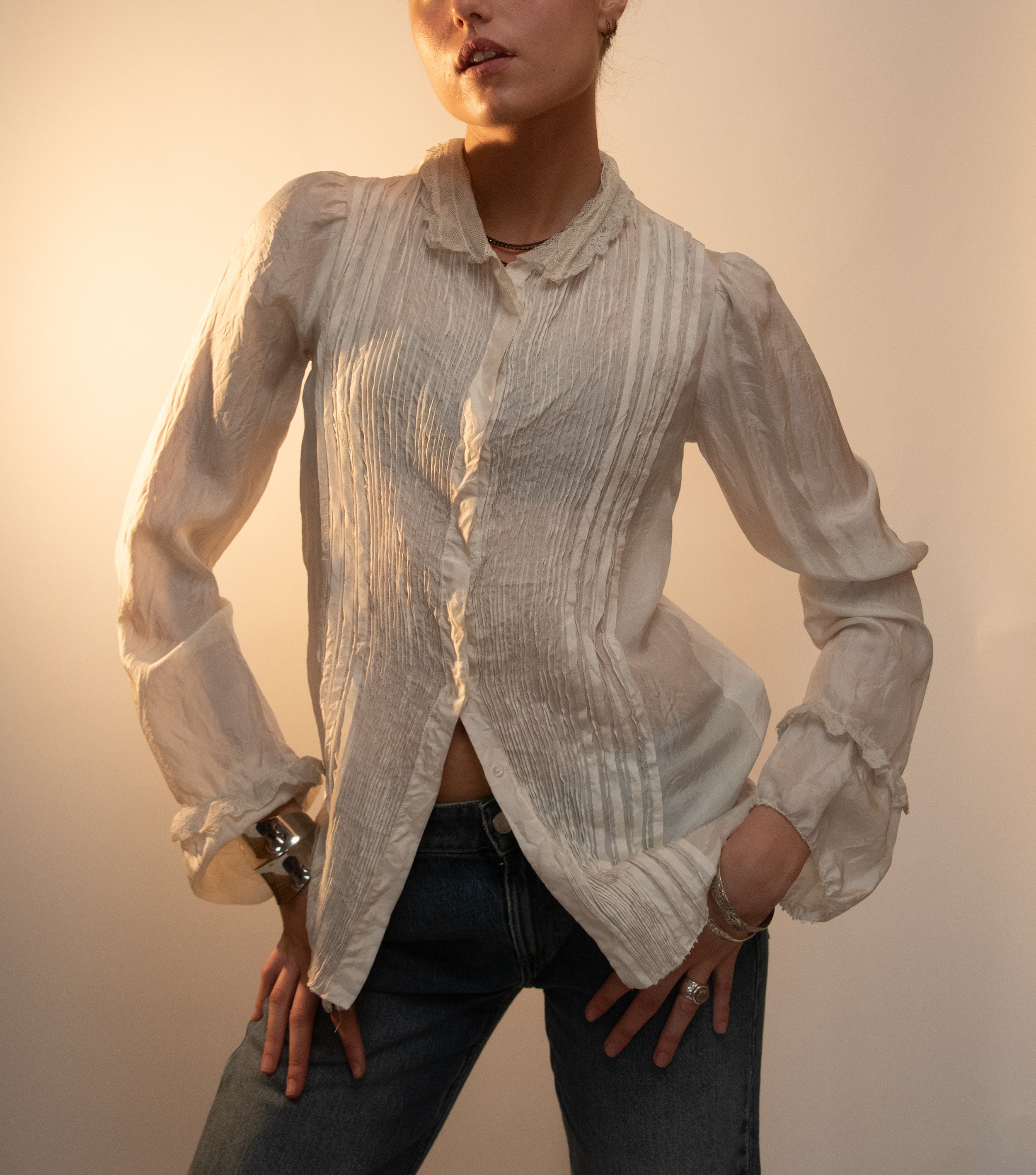 Blusa ligera blanca con pliegues verticales, cuello redondo con encaje y puños con encaje.