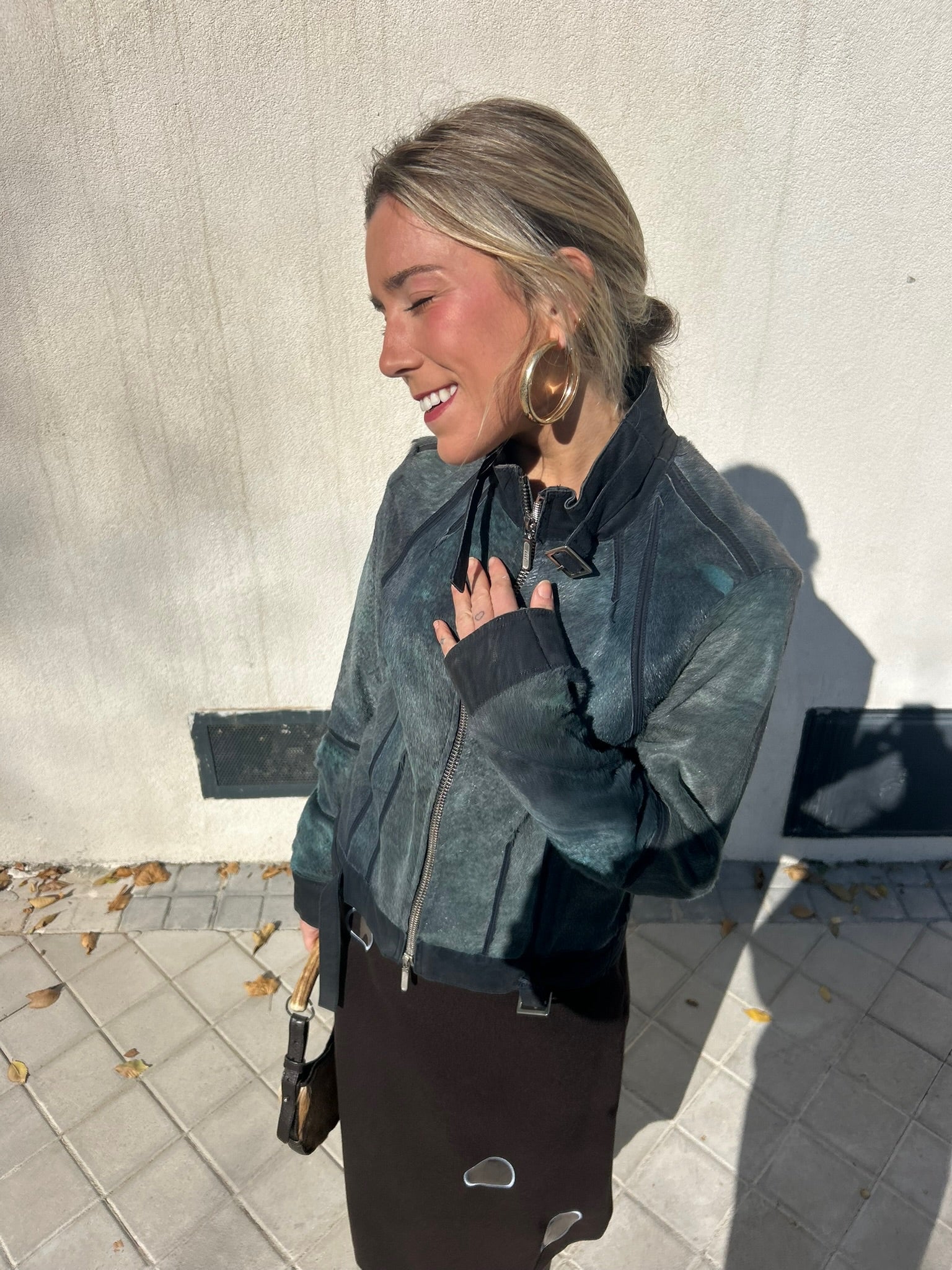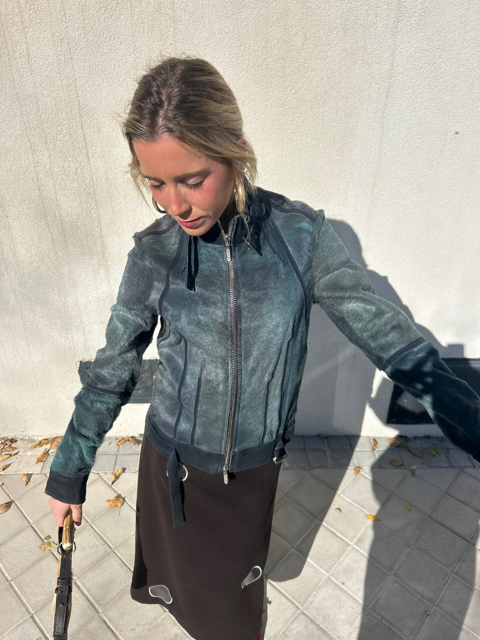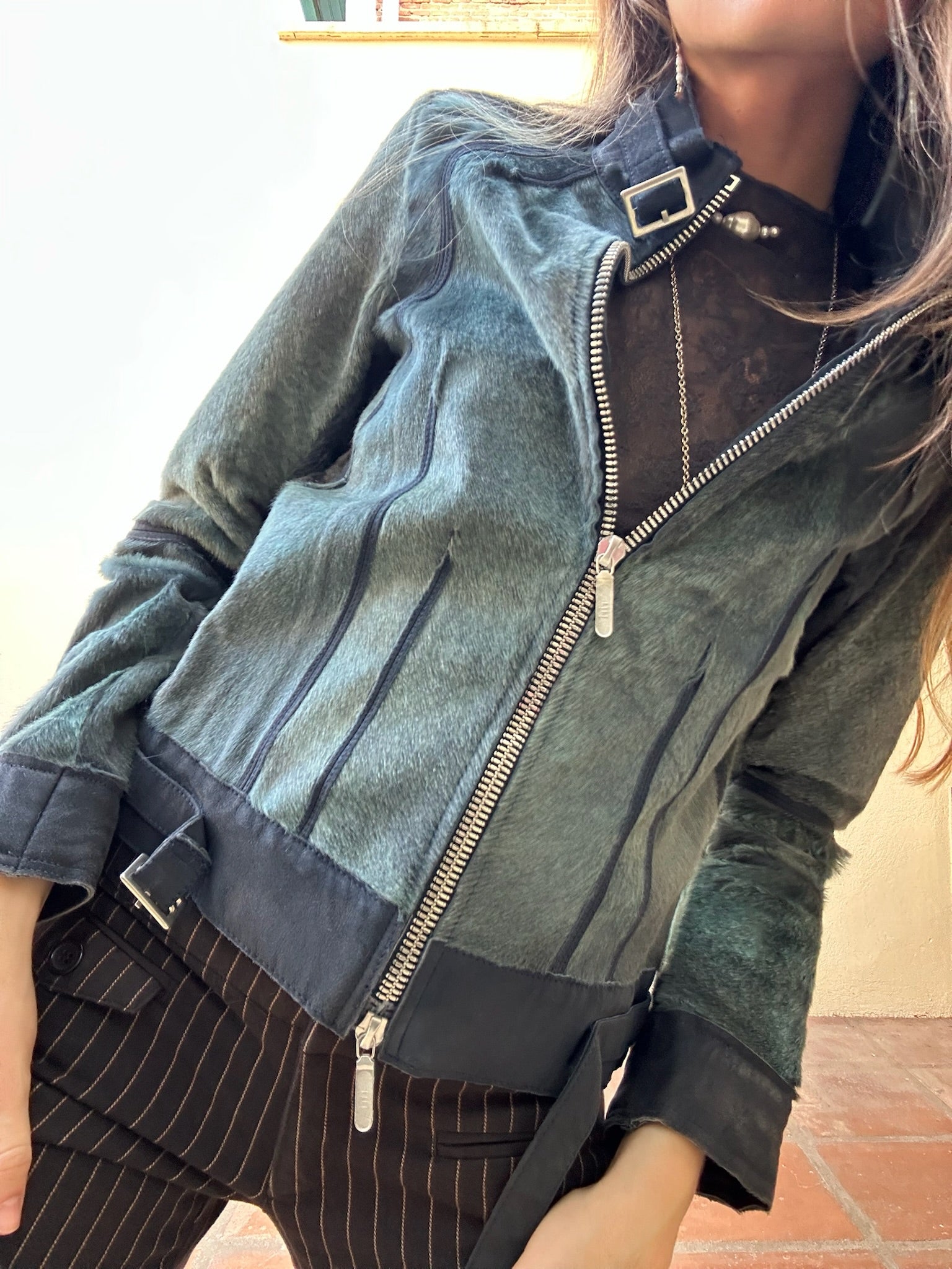 Cazadora estructurada azul de pelo duro con detalles de hebillas en cuello y cintura y cierre de cremallera.