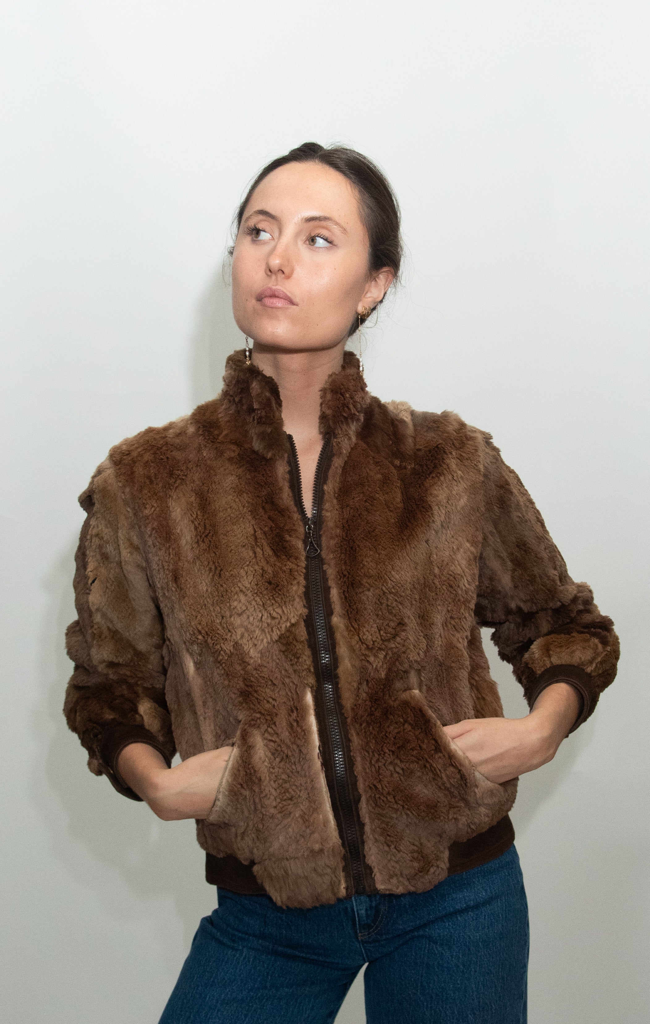 Cazadora corta de pelo sintético marrón con puños y cuello en canalé y cierre de cremallera.